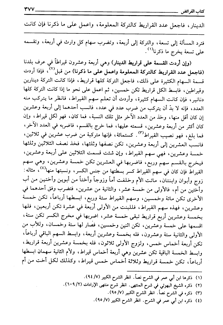 (وَإِنْ أَرَدْتَ الْقِسْمَةَ عَلَى قَرَارِيطِ الدِّينَارِ) وَهِيَ أَرْبَعَةٌ وَعِشْرُونَ قِيرَاطًا فِي عُرْفِ بَلَدِنَا (فَاجْعَلْ عَدَدَ الْقَرَارِيطِ كَالتَّرِكَةِ الْمَعْلُومَةِ، وَاعْمَلْ عَلَى مَا ذَكَرْنَا) مِنْ قَبْلُ فَإِذَا أَرَدْتَ قِسْمَةَ السِّهَامِ الْكَثِيرَةِ عَلَى ذَلِكَ، فَاجْعَلِ التَّرِكَةَ كُلَّهَا قَرَارِيطَ، فَإِذَا كَانَتِ التَّرِكَةُ دِينَارَيْنِ وَقِيرَاطَيْنِ، فَابْسُطِ الْكُلَّ قَرَارِيطَ تَكُنْ خُمْسَيْنِ، ثُمَّ اعْمَلْ عَلَى نَحْوِ مَا إِذَا كَانَتِ التَّرِكَةُ كُلُّهَا دَنَانِيرَ، فَإِنْ كَانَتِ السِّهَامُ كَثِيرَةً، وَأَرَدْتَ أَنْ تَعْلَمَ سَهْمَ الْقِيرَاطِ، فَانْظُرْ مَا يَتَرَكَّبُ مِنْهُ الْعَدَدُ، فَإِنَّهُ لَا بُدَّ أَنْ يَتَرَكَّبَ مِنْ ضَرْبِ عَدَدٍ فِي عَدَدٍ، فَانْسُبْ أَحَدَهُمَا إِلَى أَرْبَعَةٍ وَعِشْرِينَ إِنْ كَانَ أَقَلَّ مِنْهَا، وَخُذْ مِنَ الْعَدَدِ الْآخَرِ مِثْلَ تِلْكَ النِّسْبَةِ، فَمَا كَانَ، فَهُوَ لِكُلِّ قِيرَاطٍ، وَإِنْ كَانَ أَكْثَرَ مِنْ أَرْبَعَةٍ وَعِشْرِينَ، قَسَمْتَهُ عَلَيْهَا، فَمَا خَرَجَ بِالْقَسْمِ، فَاضْرِبْهُ فِي الْعَدَدِ الْآخَرِ، فَمَا بَلَغَ، فَهُوَ نَصِيبُ الْقِيرَاطِ كَسِتِّمِائَةٍ، فَإِنَّهَا مُتَرَكِّبَةٌ مِنْ ضَرْبِ عِشْرِينَ فِي ثَلَاثِينَ، فَانْسُبِ الْعِشْرِينَ إِلَى أَرْبَعَةٍ وَعِشْرِينَ، تَكُنْ نِصْفَهَا وَثُلُثَهَا، فَخُذْ نِصْفَ الثَّلَاثِينَ وَثُلُثَهَا خَمْسَةً وَعِشْرِينَ، فَهِيَ سَهْمُ الْقِيرَاطِ، وَإِنْ شِئْتَ قَسَمْتَ الثَّلَاثِينَ عَلَى أَرْبَعَةٍ وَعِشْرِينَ، فَيَخْرُجُ بِالْقَسْمِ سَهْمٌ وَرُبُعٌ، فَاضْرِبْهَا فِي الْعِشْرِينَ تَكُنْ خَمْسَةً وَعِشْرِينَ، وَهِيَ سَهْمُ الْقِيرَاطِ، فَإِنْ كَانَ فِي سَهْمِ الْقِيرَاطِ كَسْرٌ بَسَطْتَهَا مِنْ جِنْسِ الْكَسْرِ، وَنَسَبْتَهَا مِنْهَا، مِثَالُهُ: زَوْجٌ وَأَبَوَانِ وَابْنَتَانِ، مَاتَتِ الْأُمُّ وَخَلَّفَتْ أُمًّا وَزَوْجًا وَأُخْتًا مِنْ أَبَوَيْنِ وَأُخْتَيْنِ مِنْ أَبٍ وَأُخْتَيْنِ مِنْ أُمٍّ، فَالْأُولَى مِنْ خَمْسَةَ عَشَرَ، وَالثَّانِيَةُ مِنْ عِشْرِينَ، فَتَضْرِبُ وَفْقَ أَحَدِهِمَا فِي الْأُخْرَى تَكُنْ مِائَةً وَخَمْسِينَ، وَسَهْمُ الْقِيرَاطِ سِتَّةٌ وَرُبُعٌ، ابْسُطْهَا أَرْبَاعًا، تَكُنْ خَمْسَةً وَعِشْرِينَ، فَهَذِهِ سَهْمُ الْقِيرَاطِ، فَلِلْبِنْتِ مِنَ الْأُولَى أَرْبَعَةٌ فِي عَشَرَةٍ، تَكُنْ أَرْبَعِينَ، فَلَهَا بِخَمْسَةٍ وَعِشْرِينَ أَرْبَعُ قَرَارِيطَ تَبْقَى خَمْسَةَ عَشَرَ، اضْرِبْهَا فِي مُخْرَجِ الْكَسْرِ تَكُنْ سِتَّةً، اقْسِمْهَا عَلَى خَمْسَةٍ وَعِشْرِينَ تَكُنِ اثْنَيْنِ وَخَمْسِينَ، فَصَارَ لَهَا سِتَّةٌ وَخُمُسَانِ، وَلِلْأَبِ مِنَ الْأُولَى وَالثَّانِيَةِ سِتَّةٌ وَعِشْرُونَ، فَلَهُ بِخَمْسَةٍ وَعِشْرِينَ أَرْبَعَةٌ، وَابْسُطِ السَّهْمَ الْبَاقِيَ أَرْبَاعًا تَكُنْ أَرْبَعَةَ أَخْمَاسِ خُمْسٍ، وَلِزَوْجِ الْأُولَى ثَلَاثُونَ فَلَهُ بِخَمْسَةٍ وَعِشْرِينَ أَرْبَعَةُ قَرَارِيطَ، وَابْسُطِ الْخَمْسَةَ الْبَاقِيَةَ، تَكُنْ عِشْرِينَ، وَهِيَ أَرْبَعَةُ أَخْمَاسِ قِيرَاطٍ، وَلِأُمِّ الثَّانِيَةِ سَهْمَانِ ابْسُطْهَا أَرْبَاعًا، تَكُنْ خَمْسَةَ قَرَارِيطَ وَثَلَاثَةَ أَخْمَاسِ خُمْسِ قِيرَاطٍ، وَكَذَلِكَ لِكُلِّ أُخْتٍ مِنْ أُمٍّ