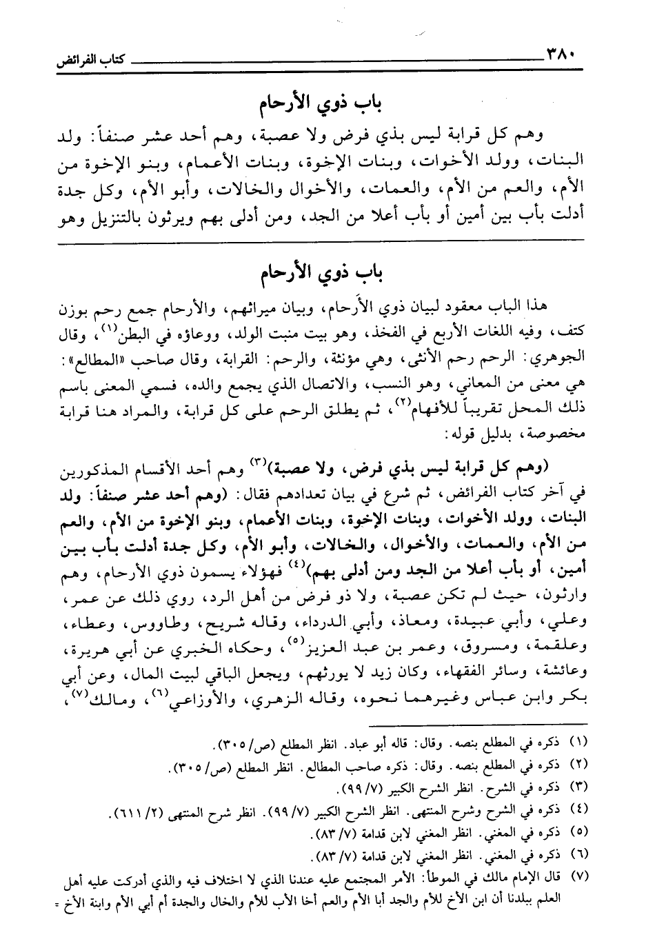 ِ هَذَا الْبَابُ مَعْقُودٌ لِبَيَانِ ذَوِي الْأَرْحَامِ، وَبَيَانِ مِيرَاثِهِمْ، وَالْأَرْحَامُ جَمْعُ رَحِمٍ بِوَزْنِ كَتِفٍ، وَفِيهِ اللُّغَاتُ الْأَرْبَعُ فِي الْفَخْذِ، وَهُوَ بَيْتُ مَنْبِتِ الْوَلَدِ، وَوِعَاؤُهُ فِي الْبَطْنِ، وَقَالَ الْجَوْهَرِيُّ: الرَّحِمُ رَحِمُ الْأُنْثَى، وَهِيَ مُؤَنَّثَةٌ، وَالرَّحِمُ: الْقَرَابَةُ، وَقَالَ صَاحِبُ الْمَطَالِعِ: هِيَ مَعْنًى مِنَ الْمَعَانِي، وَهُوَ النَّسَبُ وَالِاتِّصَالُ الَّذِي يَجْمَعُ وَالِدَهُ، فَسُمِّيَ الْمَعْنَى بِاسْمِ ذَلِكَ الْمَحَلِّ تَقْرِيبًا لِلْأَفْهَامِ، ثُمَّ يُطْلَقُ الرَّحِمُ عَلَى كُلِّ قَرَابَةٍ، وَالْمُرَادُ هُنَا قَرَابَةٌ مَخْصُوصَةٌ، بِدَلِيلِ قَوْلِهِ: