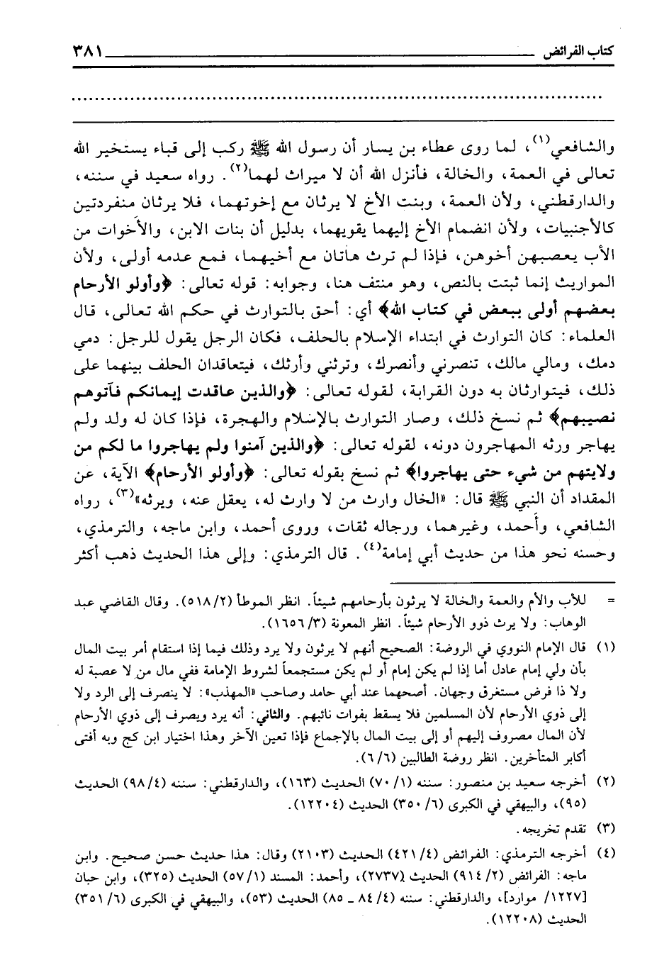 ـــــــــــــــــــــــــــــQوَالشَّافِعِيُّ، لِمَا رَوَى عَطَاءُ بْنُ يَسَارٍ: «أَنَّ رَسُولَ اللَّهِ - صَلَّى اللَّهُ عَلَيْهِ وَسَلَّمَ - رَكِبَ إِلَى قُبَاءَ يَسْتَخِيرُ اللَّهَ تَعَالَى فِي الْعَمَّةِ وَالْخَالَةِ، فَأَنْزَلَ اللَّهُ: أَنْ لَا مِيرَاثَ لَهُمَا» رَوَاهُ سَعِيدٌ فِي سُنَنِهِ وَالدَّارَقُطْنِيُّ، وَلِأَنَّ الْعَمَّةَ، وَبِنْتَ الْأَخِ لَا يَرِثَانِ مَعَ إِخْوَتِهِمَا، فَلَا يَرِثَانِ مُنْفَرِدَتَيْنِ كَالْأَجْنَبِيَّاتِ، وَلِأَنَّ انْضِمَامَ الْأَخِ إِلَيْهِمَا يُقَوِّيهِمَا، بِدَلِيلِ أَنَّ بَنَاتِ الِابْنِ وَالْأَخَوَاتِ مِنَ الْأَبِ يُعَصِّبُهُنَّ أَخُوهُنَّ، فَإِذَا لَمْ تَرِثْ هَاتَانِ مَعَ أَخِيهِمَا، فَمَعَ عَدَمِهِ أَوْلَى، وَلِأَنَّ الْمَوَارِيثَ إِنَّمَا ثَبَتَتْ بِالنَّصِّ، وَهُوَ مُنْتَفٍ هُنَا، وَجَوَابُهُ قَوْله تَعَالَى: {وَأُولُو الأَرْحَامِ بَعْضُهُمْ أَوْلَى بِبَعْضٍ فِي كِتَابِ اللَّهِ} [الأنفال: 75] أَيْ: أَحَقُّ بِالتَّوَارُثِ فِي حُكْمِ اللَّهِ تَعَالَى، قَالَ الْعُلَمَاءُ: كَانَ التَّوَارُثُ فِي ابْتِدَاءِ الْإِسْلَامِ بِالْحِلْفِ، فَكَانَ الرَّجُلُ يَقُولُ لِلرَّجُلِ: دَمِي دَمُكَ، وَمَالِي مَالُكَ تَنْصُرُنِي وَأَنْصُرُكَ، وَتَرِثُنِي وَأَرِثُكَ، فَيَتَعَاقَدَانِ الْحِلْفَ بَيْنَهُمَا عَلَى ذَلِكَ، فَيَتَوَارَثَانِ بِهِ دُونَ الْقَرَابَةِ؛ لِقَوْلِهِ تَعَالَى: {وَالَّذِينَ عَقَدَتْ أَيْمَانُكُمْ فَآتُوهُمْ نَصِيبَهُمْ} [النساء: 33] ثُمَّ نُسِخَ ذَلِكَ، وَصَارَ التَّوَارُثُ بِالْإِسْلَامِ وَالْهِجْرَةِ، فَإِذَا كَانَ لَهُ وَلَدٌ، وَلَمْ يُهَاجِرْ، وَرِثَهُ الْمُهَاجِرُونَ دُونَهُ؛ لِقَوْلِهِ تَعَالَى: {وَالَّذِينَ آمَنُوا وَلَمْ يُهَاجِرُوا مَا لَكُمْ مِنْ وَلايَتِهِمْ مِنْ شَيْءٍ حَتَّى يُهَاجِرُوا} [الأنفال: 72] ثُمَّ نُسِخَ بِقَوْلِهِ تَعَالَى: {وَأُولُو الأَرْحَامِ} [الأنفال: 75] الْآيَةَ، وَعَنِ الْمِقْدَادِ، أَنَّ النَّبِيَّ - صَلَّى اللَّهُ عَلَيْهِ وَسَلَّمَ -، قَالَ: «الْخَالُ وَارِثُ مَنْ لَا وَارِثَ لَهُ، يَعْقِلُ عَنْهُ وَيَرِثُهُ» .