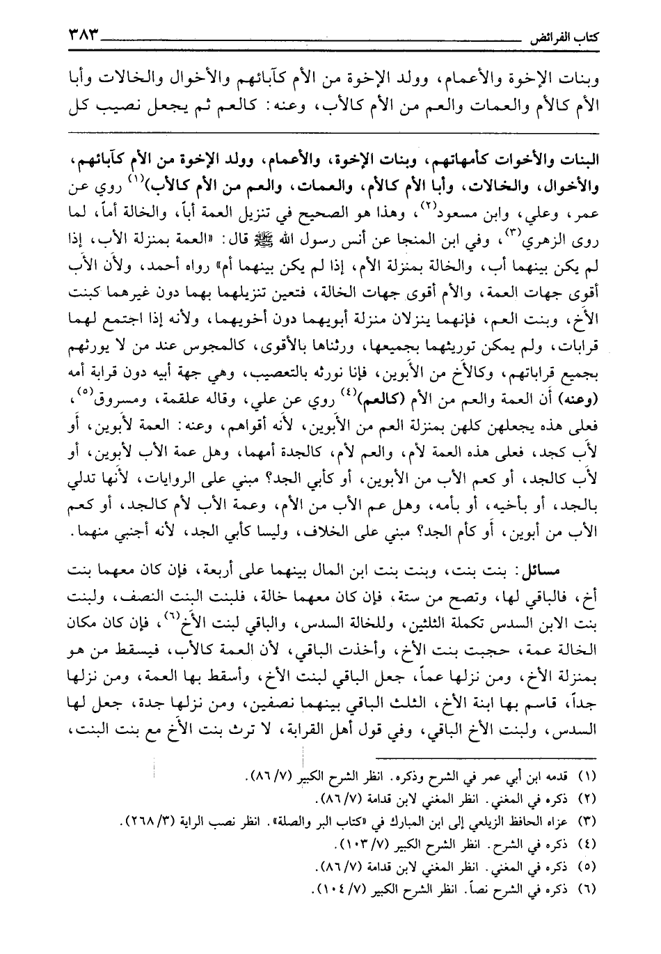 ـــــــــــــــــــــــــــــQالْبَنَاتِ وَالْأَخَوَاتِ، كَأُمَّهَاتِهِمْ، وَبَنَاتِ الْإِخْوَةِ وَالْأَعْمَامِ، وَوَلَدَ الْإِخْوَةِ مِنَ الْأُمِّ كَآبَائِهِمْ، وَالْأَخْوَالَ، وَالْخَالَاتِ، وَأَبَا الْأُمِّ كَالْأُمِّ، وَالْعَمَّاتِ، وَالْعَمَّ مِنَ الْأُمِّ كَالْأَبِ) رُوِيَ عَنْ عُمَرَ، وَعَلِيٍّ، وَابْنِ مَسْعُودٍ، وَهَذَا هُوَ الصَّحِيحُ فِي تَنْزِيلِ الْعَمَّةِ أَبًا، وَالْخَالَةِ أُمًّا، لِمَا رَوَى الزُّهْرِيُّ، وَفِي ابْنِ الْمُنَجَّا عَنْ أَنَسٍ أَنَّ رَسُولَ اللَّهِ - صَلَّى اللَّهُ عَلَيْهِ وَسَلَّمَ -، قَالَ: «الْعَمَّةُ بِمَنْزِلَةِ الْأَبِ، إِذَا لَمْ يَكُنْ بَيْنَهُمَا أَبٌ، وَالْخَالَةُ بِمَنْزِلَةِ الْأُمِّ إِذَا لَمْ يَكُنْ بَيْنَهُمَا أُمٌّ» رَوَاهُ أَحْمَدُ، وَلِأَنَّ الْأَبَ أَقْوَى جِهَاتِ الْعَمَّةِ، وَالْأُمَّ أَقْوَى جِهَاتِ الْخَالَةِ، فَتَعَيَّنَ تَنْزِيلُهُمَا بِهِمَا دُونَ غَيْرِهِمَا، كَبِنْتِ الْأَخِ، وَبِنْتِ الْعَمِّ، فَإِنَّهُمَا يُنَزَّلَانِ مَنْزِلَةَ أَبَوَيْهِمَا دُونَ أَخَوَيْهِمَا، وَلِأَنَّهُ إِذَا اجْتَمَعَ لَهُمَا قَرَابَاتٌ، وَلَمْ يُمْكِنْ تَوْرِيثُهُمَا بِجَمِيعِهَا، وَرِثْنَاهَا بِالْأَقْوَى، كَالْمَجُوسِ عِنْدَ مَنْ لَا يُوَرِّثُهُمْ بِجَمِيعِ قَرَابَاتِهِمْ، وَكَالْأَخِ مِنَ الْأَبَوَيْنِ، فَإِنَّا نُوَرِّثُهُ بِالتَّعْصِيبِ، وَهِيَ جِهَةُ أَبِيهِ دُونَ قَرَابَةِ أُمِّهِ (وَعَنْهُ) أَنَّ الْعَمَّةَ وَالْعَمَّ مِنَ الْأُمِّ (كَالْعَمِّ) رُوِيَ عَنْ عَلِيٍّ، وَقَالَهُ عَلْقَمَةُ، وَمَسْرُوقٌ، فَعَلَى هَذِهِ يَجْعَلُهُنَّ كُلَّهُنَّ بِمَنْزِلَةِ الْعَمِّ مِنَ الْأَبَوَيْنِ؛ لِأَنَّهُ أَقْوَاهُمْ، وَعَنْهُ: الْعَمَّةُ لِأَبَوَيْنِ أَوْ لِأَبٍ كَجَدٍّ، فَعَلَى هَذِهِ الْعَمَّةُ لِأُمٍّ، وَالْعَمُّ لِأُمٍّ، كَالْجَدَّةِ أُمِّهِمَا، وَهَلْ عَمَّةُ الْأَبِ لِأَبَوَيْنِ، أَوْ لِأَبٍ كَالْجَدِّ أَوْ كَعَمِّ الْأَبِ مِنَ الْأَبَوَيْنِ، أَوْ كَأَبِي الْجَدِّ؟ مَبْنِيٌّ عَلَى الرِّوَايَاتِ؛ لِأَنَّهَا تُدْلِي بِالْجَدِّ، أَوْ بِأَخِيهِ، أَوْ بِأُمِّهِ، وَهَلْ عَمُّ الْأَبِ مِنَ الْأُمِّ، وَعَمَّةُ الْأَبِ لِأُمٍّ كَالْجَدِّ، أَوْ كَعَمِّ الْأَبِ مِنْ أَبَوَيْنِ، أَوْ كَأُمِّ الْجَدِّ؟ مَبْنِيٌّ عَلَى الْخِلَافِ، وَلَيْسَا كَأَبِي الْجَدِّ؛ لِأَنَّهُ أَجْنَبِيٌّ مِنْهُمَا.