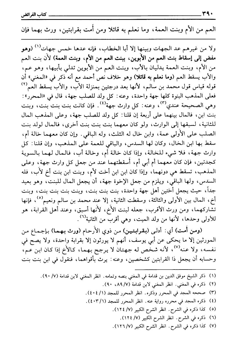 ـــــــــــــــــــــــــــــQوَلَا مِنْ غَيْرِهِمْ عَدَّ الْجِهَاتِ، وَبَيَّنَهَا إِلَّا أَبَا الْخَطَّابِ، فَإِنَّهُ عَدَّهَا خَمْسَ جِهَاتٍ (وَهُوَ مُفْضٍ إِلَى إِسْقَاطِ بِنْتِ الْعَمِّ مِنَ الْأَبَوَيْنِ بِبِنْتِ الْعَمِّ مِنَ الْأُمِّ، وَبِنْتِ الْعَمَّةِ) لِأَنَّ بِنْتَ الْعَمِّ مِنَ الْأُمِّ وَبِنْتَ الْعَمَّةِ يُدْلِيَانِ بِالْأَبِ، وَبِنْتَ الْعَمِّ مِنَ الْأَبَوَيْنِ تُدْلِي بِأَبِيهَا، وَهُوَ عَمٌّ، وَالْأَبُ يُسْقِطُ الْعَمَّ (وَمَا نَعْلَمُ بِهِ قَائِلًا) وَهُوَ خِلَافُ نَصِّ أَحْمَدَ مَعَ أَنَّهُ ذُكِرَ فِي " الْمُغْنِي " أَنَّ قَوْلَهُ قِيَاسُ قَوْلِ مُحَمَّدِ بْنِ سَالِمٍ؛ لِأَنَّهَا بَعْدَ دَرَجَتَيْنِ بِمَنْزِلَةِ الْأَبِ، وَالْأَبُ يُسْقِطُ الْعَمَّ، فَعَلَى الْمَذْهَبِ الْبُنُوَّةُ كُلُّهَا جِهَةٌ وَاحِدَةٌ، وَعَنْهُ: كُلُّ وَلَدٍ لِلصُّلْبِ جِهَةٌ، قَالَ فِي الْمُحَرَّرِ: وَهِيَ الصَّحِيحَةُ عِنْدِي، وَعَنْهُ: كُلُّ وَارِثٍ جِهَةٌ، فَإِنْ كَانَتْ بِنْتُ بِنْتِ بِنْتٍ، وَبِنْتُ بِنْتِ ابْنٍ، فَالْمَالُ بَيْنَهُمَا عَلَى أَرْبَعَةٍ، إِنْ قُلْنَا: كُلُّ وَلَدٍ لِلصُّلْبِ جِهَةٌ، وَعَلَى الْمَذْهَبِ: الْمَالُ لِلثَّانِيَةِ، لِسَبْقِهَا إِلَى الْوَارِثِ، وَلَوْ كَانَ مَعَهُمَا بِنْتُ بِنْتِ بِنْتٍ أُخْرَى، فَالْمَالُ لِوَلَدِ بِنْتِ الصُّلْبِ عَلَى الْأَوْلَى عَمَّةٌ وَابْنُ خَالٍ لَهُ الثُّلُثُ، وَلَهُ الْبَاقِي، وَإِنْ كَانَ مَعَهُمَا خَالَةُ أُمٍّ، سَقَطَ بِهَا ابْنُ الْخَالِ، وَكَانَ لَهَا السُّدُسُ، وَالْبَاقِي لِلْعَمَّةِ عَلَى الْمَذْهَبِ، وَإِنْ قُلْنَا: كُلُّ وَارِثٍ جِهَةٌ، فَلَا شَيْءَ لِلْخَالَةِ، وَإِذَا كَانَ خَالَةُ أُمٍّ، وَخَالَةُ أَبٍ، فَالْمَالُ لَهُمَا بِالسَّوِيَّةِ، كَجَدَّتَيْنِ، فَإِنْ كَانَ مَعَهُمَا أُمُّ أَبِي أُمٍّ، أَسْقَطَتْهُمَا عِنْدَ مَنْ جَعَلَ كُلَّ وَارِثٍ جِهَةً، وَعَلَى الْمَذْهَبِ، تَسْقُطُ هِيَ دُونَهُمَا، وَإِذَا كَانَ ابْنُ ابْنِ أُخْتٍ لِأُمٍّ، وَبِنْتُ ابْنِ بِنْتِ أَخٍ لِأَبٍ، فَلَهُ السُّدُسُ، وَلَهَا الْبَاقِي، وَيَلْزَمُ مَنْ جَعَلَ الْأُخُوَّةَ جِهَةً، أَنْ يَجْعَلَ الْمَالَ لِلْبِنْتِ، وَهُوَ بَعِيدٌ جِدًّا، حَيْثُ يَجْعَلُ أُخْتَيْنِ أَهْلَ جِهَةٍ وَاحِدَةٍ. بِنْتُ بِنْتِ بِنْتٍ، وَبِنْتُ بِنْتِ بِنْتِ بِنْتٍ، وَبِنْتُ أَخٍ، الْمَالُ بَيْنَ الْأُولَى وَالثَّالِثَةِ، وَسَقَطَتِ الثَّانِيَةُ، إِلَّا عِنْدَ مُحَمَّدِ بْنِ سَالِمٍ وَنُعَيْمٍ، فَإِنَّهَا تُشَارِكُهُمَا، وَمَنْ وَرَّثَ الْأَقْرَبَ جَعَلَهُ لِبِنْتِ الْأَخِ؛ لِأَنَّهَا أَسْبَقُ، وَعِنْدَ أَهْلِ الْقَرَابَةِ، هُوَ لِلْأُولَى وَحْدَهَا؛ لِأَنَّهَا مِنْ وَلَدِ الْمَيِّتِ، وَهِيَ أَقْرَبُ مِنَ الثَّانِيَةِ.