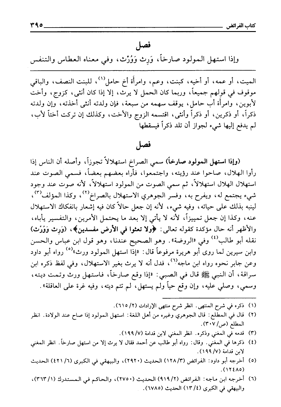 فَصْلٌ (وَإِذَا اسْتَهَلَّ الْمَوْلُودُ صَارِخًا) سُمِّيَ الصُّرَاخُ اسْتِهْلَالًا تَجَوُّزًا، وَأَصْلُهُ أَنَّ النَّاسَ إِذَا رَأَوُا الْهِلَالَ، صَاحُوا عِنْدَ رُؤْيَتِهِ، وَاجْتَمَعُوا، فَأَرَاهُ بَعْضُهُمْ بَعْضًا، فَسُمِّيَ الصَّوْتُ عِنْدَ اسْتِهْلَالِ الْهِلَالِ اسْتِهْلَالًا، ثُمَّ سُمِّيَ الصَّوْتُ مِنَ الْمَوْلُودِ اسْتِهْلَالًا؛ لِأَنَّهُ صَوَّتَ عِنْدَ وُجُودِ شَيْءٍ يُجْتَمَعُ لَهُ، وَيُفْرَحُ بِهِ، وَفَسَّرَ الْجَوْهَرِيُّ الِاسْتِهْلَالَ بِالصُّرَاخِ، وَكَذَا الْمُؤَلِّفُ، لِيُنَبِّهَ بِذَلِكَ عَلَى حَيَاتِهِ، وَفِيهِ شَيْءٌ؛ لِأَنَّهُ إِنْ جُعِلَ حَالًا كَانَ فِيهِ إِشْعَارٌ بِانْفِكَاكِ الِاسْتِهْلَالِ عَنْهُ، وَكَذَا إِنْ جُعِلَ تَمْيِيزًا؛ لِأَنَّهُ لَا يَأْتِي إِلَّا بَعْدَ مَا يَحْتَمِلُ الْأَمْرَيْنِ، وَالتَّفْسِيرُ يَأْبَاهُ، وَالْأَظْهَرُ أَنَّهُ حَالٌ مُؤَكَّدَةٌ كَقَوْلِهِ تَعَالَى: {وَلا تَعْثَوْا فِي الأَرْضِ مُفْسِدِينَ} [البقرة: 60] (وَرِثَ، وَوَرَّثَ) نَقَلَهُ أَبُو طَالِبٍ، وَفِي " الرَّوْضَةِ "، وَهُوَ الصَّحِيحُ عِنْدَنَا، وَهُوَ قَوْلُ ابْنِ عَبَّاسٍ، وَالْحَسَنِ، وَابْنِ سِيرِينَ، لِمَا رَوَى أَبُو هُرَيْرَةَ مَرْفُوعًا، قَالَ: «إِذَا اسْتَهَلَّ الْمَوْلُودُ وَرِثَ» رَوَاهُ أَبُو دَاوُدَ، وَعَنْ جَابِرٍ نَحْوَهُ، رَوَاهُ ابْنُ مَاجَهْ، فَدَلَّ أَنَّهُ لَا يَرِثُ بِغَيْرِ الِاسْتِهْلَالِ، وَفِي لَفْظٍ ذَكَرَهُ ابْنُ سُرَاقَةَ أَنَّ النَّبِيَّ - صَلَّى اللَّهُ عَلَيْهِ وَسَلَّمَ -، «قَالَ فِي الصَّبِيِّ: إِذَا وَقَعَ صَارِخًا، فَاسْتَهَلَّ وَرِثَ وَتَمَّتْ دِيَتُهُ وَسُمِّيَ وَصُلِّيَ عَلَيْهِ، وَإِنْ وَقَعَ حَيًّا وَلَمْ يَسْتَهِلَّ لَمْ تَتِمَّ دِيَتُهُ وَفِيهِ غُرَّةٌ عَلَى الْعَاقِلَةِ» .