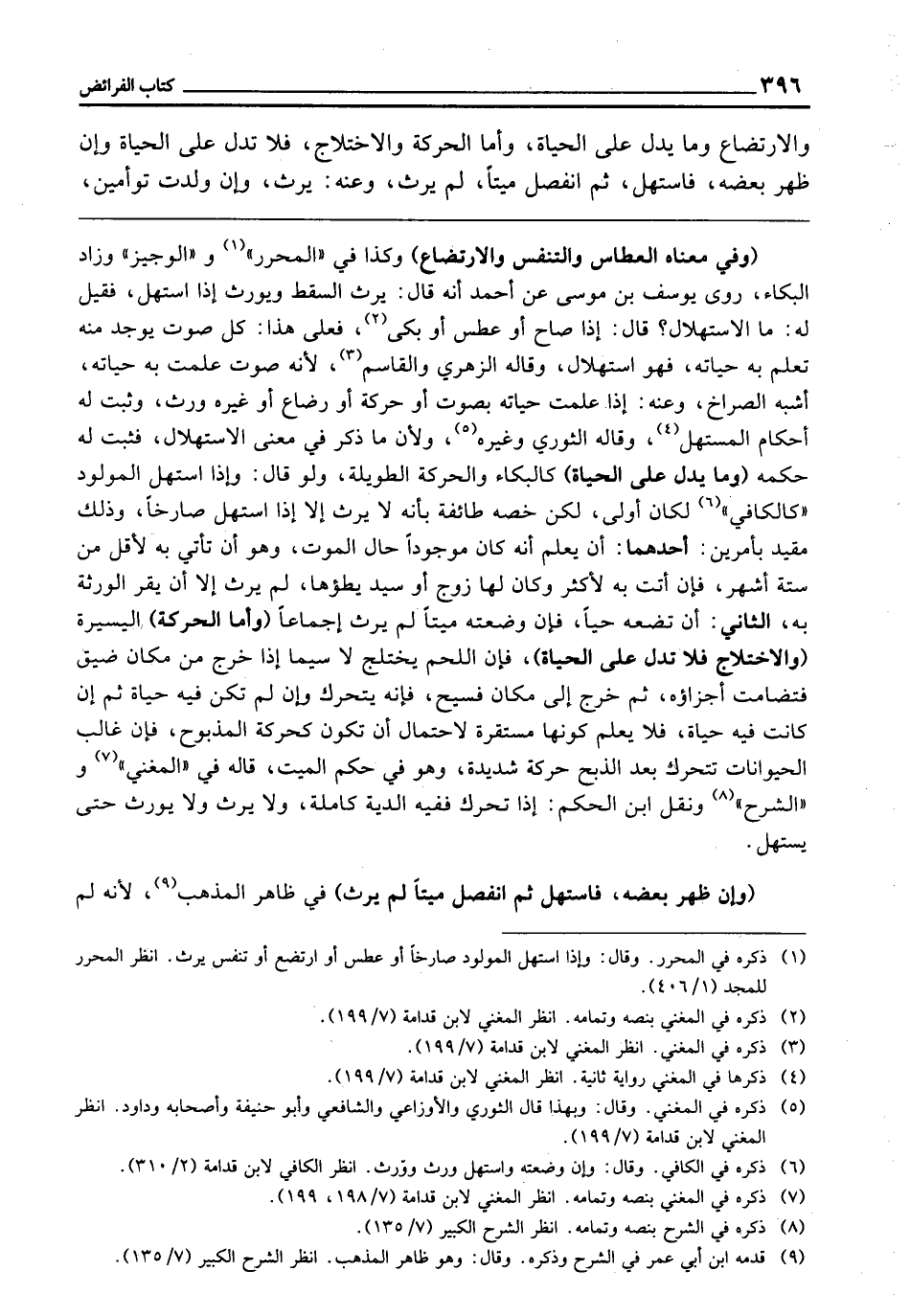 ـــــــــــــــــــــــــــــQ (وَفِي مَعْنَاهُ الْعُطَاسُ وَالتَّنَفُّسُ وَالِارْتِضَاعُ) وَكَذَا فِي الْمُحَرَّرِ وَالْوَجِيزِ، وَزَادَ الْبُكَاءَ، رَوَى يُوسُفُ بْنُ مُوسَى عَنْ أَحْمَدَ، أَنَّهُ قَالَ: يَرِثُ السَّقْطُ وَيُورَثُ إِذَا اسْتَهَلَّ، فَقِيلَ لَهُ: مَا الِاسْتِهْلَالُ؟ قَالَ: إِذَا صَاحَ أَوْ عَطَسَ أَوْ بَكَى، فَعَلَى هَذَا: كُلُّ صَوْتٍ يُوجَدُ مِنْهُ تُعْلَمُ بِهِ حَيَاتُهُ، فَهُوَ اسْتِهْلَالٌ، وَقَالَهُ الزُّهْرِيُّ وَالْقَاسِمُ، لِأَنَّهُ صَوْتٌ عُلِمَتْ بِهِ حَيَاتُهُ، أَشْبَهَ الصُّرَاخَ، وَعَنْهُ: إِذَا عُلِمَتْ حَيَاتُهُ بِصَوْتٍ أَوْ حَرَكَةٍ أَوْ رَضَاعٍ أَوْ غَيْرِهِ وَرِثَ، وَثَبَتَ لَهُ أَحْكَامُ الْمُسْتَهِلِّ، وَقَالَهُ الثَّوْرِيُّ وَغَيْرُهُ، وَلِأَنَّ مَا ذُكِرَ فِي مَعْنَى الِاسْتِهْلَالِ، فَثَبَتَ لَهُ حُكْمُهُ (وَمَا يَدُلُّ عَلَى الْحَيَاةِ) كَالْبُكَاءِ وَالْحَرَكَةِ الطَّوِيلَةِ، وَلَوْ قَالَ: وَإِذَا اسْتَهَلَّ الْمَوْلُودُ كَالْكَافِي لَكَانَ أَوْلَى، لَكِنْ خَصَّهُ طَائِفَةٌ بِأَنَّهُ لَا يَرِثُ إِلَّا إِذَا اسْتَهَلَّ صَارِخًا، وَذَلِكَ مُقَيَّدٌ بِأَمْرَيْنِ: أَحَدُهُمَا: أَنْ يُعْلَمَ أَنَّهُ كَانَ مَوْجُودًا حَالَ الْمَوْتِ، وَهُوَ أَنْ تَأْتِيَ بِهِ لِأَقَلَّ مِنْ سِتَّةِ أَشْهُرٍ، فَإِنْ أَتَتْ بِهِ لِأَكْثَرَ، وَكَانَ لَهَا زَوْجٌ أَوْ سَيِّدٌ يَطَؤُهَا، لَمْ يَرِثْ إِلَّا أَنْ يُقِرَّ الْوَرَثَةُ بِهِ، الثَّانِي: أَنْ تَضَعَهُ حَيًّا، فَإِنْ وَضَعَتْهُ مَيِّتًا لَمْ يَرِثْ إِجْمَاعًا (وَأَمَّا الْحَرَكَةُ) الْيَسِيرَةُ (وَالِاخْتِلَاجُ فَلَا تَدُلُّ عَلَى الْحَيَاةِ) فَإِنَّ اللَّحْمَ يَخْتَلِجُ لَا سِيَّمَا إِذَا خَرَجَ مِنْ مَكَانٍ ضَيِّقٍ، فَتَضَامَّتْ أَجْزَاؤُهُ، ثُمَّ خَرَجَ إِلَى مَكَانٍ فَسِيحٍ، فَإِنَّهُ يَتَحَرَّكُ وَإِنْ لَمْ تَكُنْ فِيهِ حَيَاةٌ، ثُمَّ إِنْ كَانَتْ فِيهِ حَيَاةٌ، فَلَا يُعْلَمُ كَوْنُهَا مُسْتَقِرَّةً؛ لِاحْتِمَالِ أَنْ تَكُونَ كَحَرَكَةِ الْمَذْبُوحِ، فَإِنَّ غَالِبَ الْحَيَوَانَاتِ تَتَحَرَّكُ بَعْدَ الذَّبْحِ حَرَكَةً شَدِيدَةً، وَهُوَ فِي حُكْمِ الْمَيِّتِ، قَالَهُ فِي " الْمُغْنِي " وَ " الشَّرْحِ "، وَنَقَلَ ابْنُ الْحَكَمِ: إِذَا تَحَرَّكَ فَفِيهِ الدِّيَةُ كَامِلَةٌ، وَلَا يَرِثُ وَلَا يُورَثُ حَتَّى يَسْتَهِلَّ.