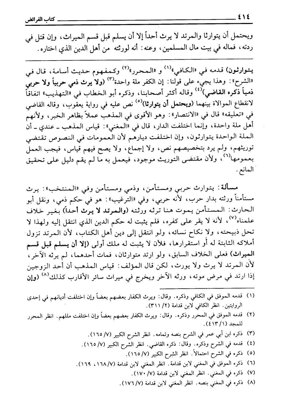 وَيَحْتَمِلُ أَنْ يَتَوَارَثَا، وَالْمُرْتَدُّ لَا يَرِثُ أَحَدًا، إِلَّا أَنْ يُسْلِمَ قَبْلَ قَسْمِ الْمِيرَاثِ، وَإِنْ قُتِلَ فِي رِدَّتِهِ، فَمَا لَهُ فِي بَيْتِ مَالِ الْمُسْلِمِينَ، وَعَنْهُ: أنه لِوَرَثَتِهِ مِنْ أَهْلِ الدِّينِ الَّذِي اخْتَارَهُ.