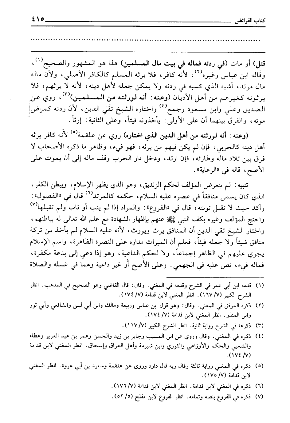 تَنْبِيهٌ: لَمْ يَتَعَرَّضِ الْمُؤَلِّفُ لِحُكْمِ الزِّنْدِيقِ، وَهُوَ الَّذِي يُظْهِرُ الْإِسْلَامَ وَيُبْطِنُ الْكُفْرَ، الَّذِي كَانَ يُسَمَّى مُنَافِقًا فِي عَصْرِهِ - عَلَيْهِ السَّلَامُ -، حُكْمُهُ كَالْمُرْتَدِّ، قَالَ فِي " الْفُصُولِ ": وَآكَدُ حَيْثُ لَا تُقْبَلُ تَوْبَتُهُ، قَالَ فِي " الْفُرُوعِ ": وَالْمُرَادُ إِذَا لَمْ يَتُبْ أَوْ تَابَ وَلَمْ يَقْبَلْهَا، وَاحْتَجَّ الْمُؤَلِّفُ وَغَيْرُهُ: بِكَفِّ النَّبِيِّ - صَلَّى اللَّهُ عَلَيْهِ وَسَلَّمَ - عَنْهُمْ بِإِظْهَارِ الشَّهَادَةِ مَعَ عِلْمِ اللَّهِ تَعَالَى لَهُ بِبَاطِنِهِمْ، وَاخْتَارَ الشَّيْخُ تَقِيُّ الدِّينِ أَنَّ الْمُنَافِقَ يَرِثُ وَيُورَثُ؛ لِأَنَّهُ - عَلَيْهِ السَّلَامُ - لَمْ يَأْخُذْ مِنْ تَرِكَةِ مُنَافِقٍ شَيْئًا، وَلَا جَعَلَهُ فَيْئًا، فَعُلِمَ أَنَّ الْمِيرَاثَ مَدَارُهُ عَلَى النُّصْرَةِ الظَّاهِرَةِ، وَاسْمُ الْإِسْلَامِ يَجْرِي عَلَيْهِمْ فِي الظَّاهِرِ إِجْمَاعًا، وَلَا لِحُكْمِ الدَّاعِيَةِ، وَهُوَ إِذَا دُعِيَ إِلَى بِدْعَةٍ مُكَفِّرَةٍ، فَمَالُهُ فَيْءٌ، نُصَّ عَلَيْهِ فِي الْجَهْمِيِّ، وَعَلَى الْأَصَحِّ أَوْ غَيْرِ دَاعِيَةٍ وَهُمَا فِي غُسْلِهِ وَالصَّلَاةِ