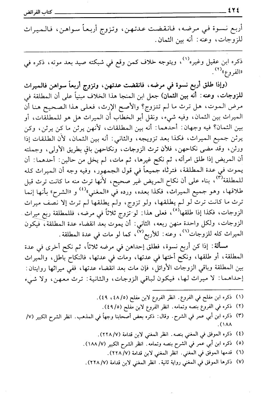 (وَإِذَا طَلَّقَ أَرْبَعَ نِسْوَةٍ فِي مَرَضِهِ، فَانْقَضَتْ عِدَّتُهُنَّ، وَتَزَوَّجَ أَرْبَعًا سِوَاهُنَّ، فَالْمِيرَاثُ لِلزَّوْجَاتِ، وَعَنْهُ: أَنَّهُ بَيْنَ الثَّمَانِ) جَعَلَ ابْنُ الْمُنَجَّا هَذَا الْخِلَافَ مَبْنِيًّا عَلَى أَنَّ الْمُطَلَّقَةَ فِي مَرَضِ الْمَوْتِ، هَلْ تَرِثُ مَا لَمْ تَتَزَوَّجْ؛ وَالْأَصَحُّ الْإِرْثُ، فَعَلَى هَذَا الصَّحِيحُ هُنَا أَنَّ الْمِيرَاثَ بَيْنَ الثَّمَانِ، وَفِيهِ شَيْءٌ، وَنَقَلَ أَبُو الْخَطَّابِ: أَنَّ الْمِيرَاثَ هَلْ هُوَ لِلْمُطَلَّقَاتِ، أَوْ بَيْنَ الثَّمَانِ؛ فِيهِ وَجْهَانِ، أَحَدُهُمَا: أَنَّهُ بَيْنَ الْمُطَلَّقَاتِ؛ لِأَنَّهُنَّ يَرِثْنَ مَا كُنَّ يَرِثْنَ، وَكُنَّ يَرِثْنَ جَمِيعَ الْمِيرَاثِ، فَكَذَا بَعْدَ تَزْوِيجِهِ، وَالثَّانِي: أَنَّهُ بَيْنَ الثَّمَانِ؛ لِأَنَّ الْمُطَلَّقَاتِ إِذَا وَرِثْنَ، وَقَدْ مَضَى نِكَاحُهُنَّ، فَلِأَنْ تَرِثَ الزَّوْجَاتُ، وَنِكَاحُهُنَّ بَاقٍ بِطَرِيقِ الْأَوْلَى، وَجُمْلَتُهُ أَنَّ الْمَرِيضَ إِذَا طَلَّقَ امْرَأَتَهُ، ثُمَّ نَكَحَ غَيْرَهَا، ثُمَّ مَاتَ، لَمْ يَخْلُ مِنْ حَالَيْنِ: أَحَدُهُمَا: أَنْ يَمُوتَ فِي عِدَّةِ الْمُطَلَّقَةِ، فَتَرِثَاهُ جَمِيعًا فِي قَوْلِ الْجُمْهُورِ، وَفِيهِ وَجْهٌ أَنَّ الْمِيرَاثَ كُلَّهُ لِلْمُطَلَّقَةِ، بِنَاءً عَلَى أَنَّ نِكَاحَ الْمَرِيضِ غَيْرُ صَحِيحٍ؛ لِأَنَّهَا تَرِثُ مِنْهُ مَا كَانَتْ تَرِثُ قَبْلَ طَلَاقِهَا، وَهُوَ جَمِيعُ الْمِيرَاثِ، فَكَذَا بَعْدَهُ، وَرَدَّهُ فِي " الْمُغْنِي " وَ " الشَّرْحِ ": بِأَنَّهَا إِنَّمَا تَرِثُ مَا كَانَتْ تَرِثُ لَوْ لَمْ يُطَلِّقْهَا، وَلَوْ تَزَوَّجَ وَلَمْ يُطَلِّقْهَا، لَمْ تَرِثْ إِلَّا نِصْفَ مِيرَاثِ الزَّوْجَاتِ، فَكَذَا إِذَا طَلَّقَهَا، فَعَلَى هَذَا: لَوْ تَزَوَّجَ ثَلَاثًا فِي مَرَضِهِ، فَلِلْمُطَلَّقَةِ رُبُعُ مِيرَاثِ الزَّوْجَاتِ، وَلِكُلِّ وَاحِدَةٍ مِنْهُنَّ رُبُعُهُ، الثَّانِي: أَنْ يَمُوتَ بَعْدَ انْقِضَاءِ عِدَّةِ الْمُطَلَّقَةِ، فَيَكُونُ الْمِيرَاثُ كُلُّهُ لِلزَّوْجَاتِ، وَعَنْهُ: لِلْأَرْبَعِ، كَمَا لَوْ مَاتَ فِي عِدَّةِ الْمُطَلَّقَةِ.