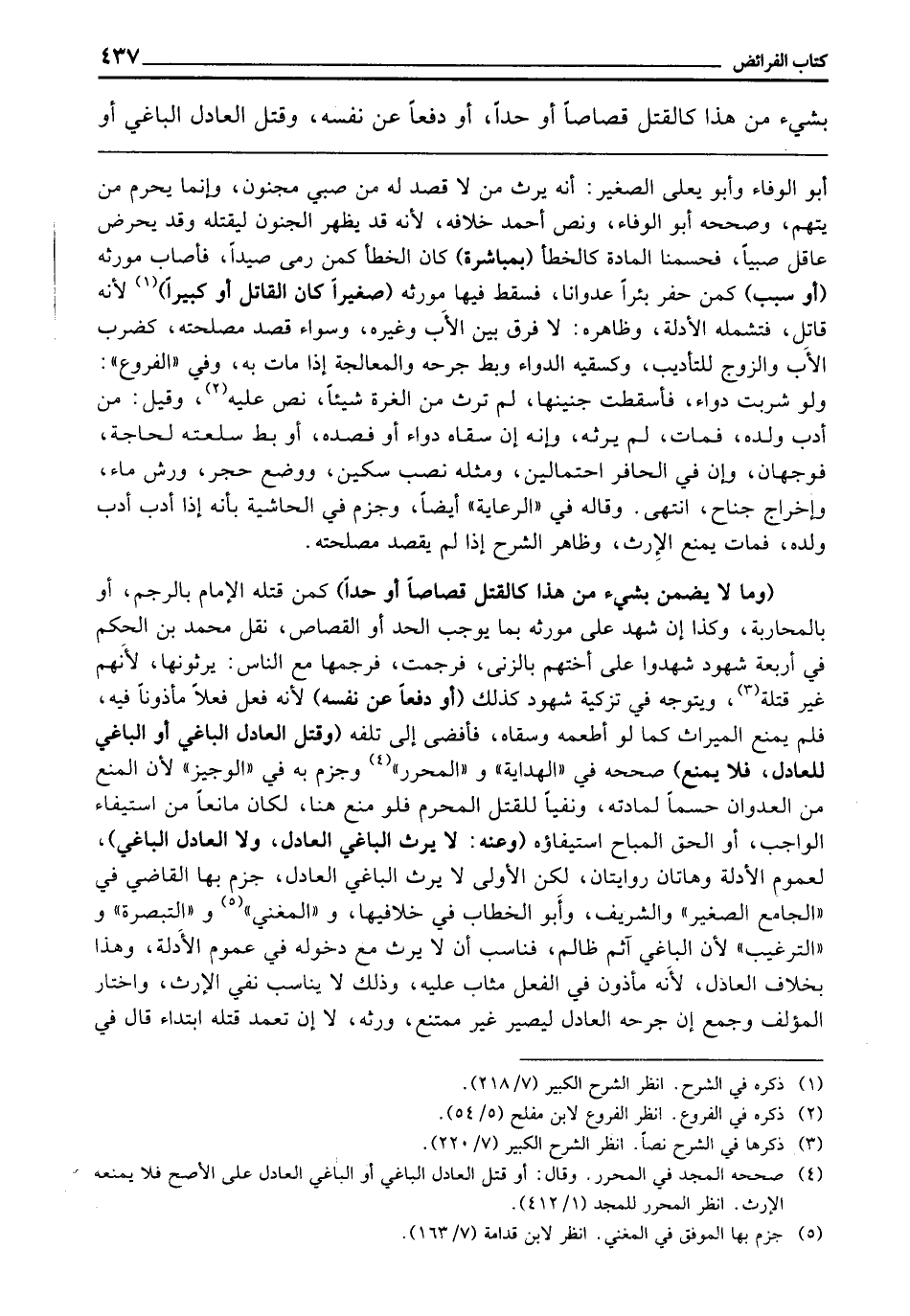 (وَمَا لَا يُضْمَنُ بِشَيْءٍ مِنْ هَذَا كَالْقَتْلِ قِصَاصًا أَوْ حَدًّا) كَمَنْ قَتَلَهُ الْإِمَامُ بِالرَّجْمِ، أَوْ بِالْمُحَارَبَةِ، وَكَذَا إِنْ شَهِدَ عَلَى مُوَرِّثِهِ بِمَا يُوجِبُ الْحَدَّ أَوِ الْقِصَاصَ، نَقَلَ مُحَمَّدُ بْنُ الْحَكَمِ فِي أَرْبَعَةِ شُهُودٍ شَهِدُوا عَلَى أُخْتِهِمْ بِالزِّنَا، فَرُجِمَتْ، فَرَجَمَهَا مَعَ النَّاسِ: يَرِثُونَهَا؛ لِأَنَّهُمْ غَيْرُ قَتَلَةٍ، وَيَتَوَجَّهُ فِي تَزْكِيَةِ شُهُودٍ كَذَلِكَ (أَوْ دَفْعًا عَنْ نَفْسِهِ) لِأَنَّهُ فَعَلَ فِعْلًا مَأْذُونًا فِيهِ، فَلَمْ يُمْنَعِ الْمِيرَاثَ، كَمَا لَوْ أَطْعَمَهُ وَسَقَاهُ، فَأَفْضَى إِلَى تَلَفِهِ (وَقَتْلِ الْعَادِلِ الْبَاغِيَ، أَوِ الْبَاغِي لِلْعَادِلِ، فَلَا يَمْنَعُ) صَحَّحَهُ فِي الْهِدَايَةِ وَالْمُحَرَّرِ، وَجَزَمَ بِهِ فِي الْوَجِيزِ؛ لِأَنَّ الْمَنْعَ مِنَ الْعُدْوَانِ حَسْمًا لِمَادَّتِهِ، وَنَفْيًا لِلْقَتْلِ الْمُحَرَّمِ، فَلَوْ مَنَعَ هُنَا، لَكَانَ مَانِعًا مِنِ اسْتِيفَاءِ الْوَاجِبِ، أَوِ الْحَقِّ الْمُبَاحِ اسْتِيفَاؤُهُ (وَعَنْهُ: لَا يَرِثُ الْبَاغِي الْعَادِلَ، وَلَا الْعَادِلُ الْبَاغِيَ) لِعُمُومِ الْأَدِلَّةِ، وَهَاتَانِ رِوَايَتَانِ، لَكِنَّ الْأَوْلَى لَا يَرِثُ الْبَاغِي الْعَادِلَ، جَزَمَ بِهَا الْقَاضِي فِي الْجَامِعِ الصَّغِيرِ، وَالشَّرِيفُ وَأَبُو الْخَطَّابِ فِي خِلِاَفَيْهَا، وَالْمُغْنِي وَالتَّبْصِرَةِ وَالتَّرْغِيبِ؛ لِأَنَّ الْبَاغِيَ آثِمٌ ظَالِمٌ، فَنَاسَبَ أَنْ لَا يَرِثَ مَعَ دُخُولِهِ فِي عُمُومِ الْأَدِلَّةِ، وَهَذَا بِخِلَافِ الْعَادِلِ؛ لِأَنَّهُ مَأْذُونٌ فِي الْفِعْلِ مُثَابٌ عَلَيْهِ، وَذَلِكَ لَا يُنَاسِبُ نَفْيَ الْإِرْثِ، وَاخْتَارَ الْمُؤَلِّفُ وَجَمْعٌ إِنْ جَرَحَهُ الْعَادِلُ لِيَصِيرَ غَيْرَ مُمْتَنِعٍ، وَرِثَهُ، لَا إِنْ تَعَمَّدَ قَتْلَهُ ابْتِدَاءً، قَالَ فِي