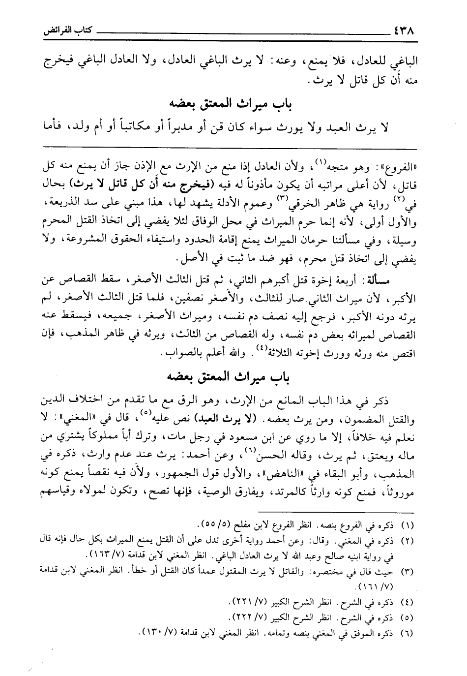 ـــــــــــــــــــــــــــــQالْفُرُوعِ: وَهُوَ مُتَّجِهٌ، وَلِأَنَّ الْعَادِلَ إِذَا مُنِعَ مِنَ الْإِرْثِ مَعَ الْإِذْنِ، جَازَ أَنْ يُمْنَعَ مِنْهُ كُلُّ قَاتِلٍ؛ لِأَنَّ أَعْلَى مَرَاتِبِهِ أَنْ يَكُونَ مَأْذُونًا لَهُ فِيهِ (فَيَخْرُجُ مِنْهُ أَنَّ كُلَّ قَاتِلٍ لَا يَرِثُ) بِحَالٍ فِي رِوَايَةٍ هِيَ ظَاهِرُ الْخِرَقِيِّ، وَعُمُومُ الْأَدِلَّةِ يَشْهَدُ لَهَا، وَهَذَا مَبْنِيٌّ عَلَى سَدِّ الذَّرِيعَةِ، وَالْأَوَّلُ أَوْلَى؛ لِأَنَّهُ إِنَّمَا حَرَّمَ الْمِيرَاثَ فِي مَحَلِّ الْوِفَاقِ، لِئَلَّا يُفْضِي إِلَى اتِّخَاذِ الْقَتْلِ الْمُحَرَّمِ وَسِيلَةً، وَفِي مَسْأَلَتِنَا حِرْمَانُ الْمِيرَاثِ يَمْنَعُ إِقَامَةَ الْحُدُودِ وَاسْتِيفَاءَ الْحُقُوقِ الْمَشْرُوعَةِ، وَلَا يُفْضِي إِلَى اتِّخَاذِ قَتْلٍ مُحَرَّمٍ، فَهُوَ ضِدُّ مَا ثَبَتَ فِي الْأَصْلِ.