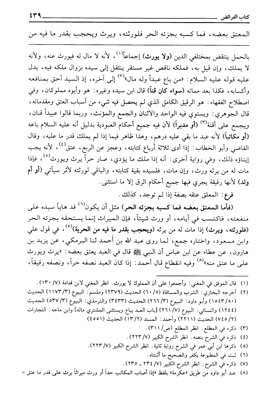 (فَأَمَّا الْمُعْتَقُ بَعْضُهُ فَمَا كَسَبَهُ بِجُزْئِهِ الْحُرِّ) مِثْلَ أَنْ يَكُونَ قَدْ هَايَأَ سَيِّدَهُ عَلَى مَنْفَعَتِهِ، فَاكْتَسَبَ فِي أَيَّامِهِ، أَوْ وَرِثَ شَيْئًا، فَإِنَّ الْمِيرَاثَ إِنَّمَا يَسْتَحِقُّهُ بِجُزْئِهِ الْحُرِّ (فَلِوَرَثَتِهِ، وَيَرِثُ) إِذَا مَاتَ لَهُ مَنْ يَرِثُهُ (وَيُحْجَبُ بِقَدْرِ مَا فِيهِ مِنَ الْحُرِّيَّةِ) فِي قَوْلِ عَلِيٍّ وَابْنِ مَسْعُودٍ، وَاخْتَارَهُ جَمْعٌ، لِمَا رَوَى عَبْدُ اللَّهِ بْنُ أَحْمَدَ، ثَنَا الْبَرْمَكِيُّ، عَنْ يَزِيدَ بْنِ هَارُونَ، عَنْ عَطَاءٍ عَنِ ابْنِ عَبَّاسٍ «أَنَّ النَّبِيَّ - صَلَّى اللَّهُ عَلَيْهِ وَسَلَّمَ - قَالَ فِي الْعَبْدِ يُعْتَقُ بَعْضُهُ: يَرِثُ وَيُورَثُ عَلَى مَا عَتَقَ مِنْهُ» وَفِيهِ انْقِطَاعٌ، قَالَ أَحْمَدُ: إِذَا كَانَ الْعَبْدُ نِصْفُهُ حُرًّا وَنِصْفُهُ رَقِيقًا،