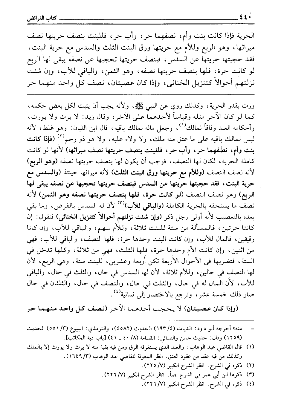 الْحُرِّيَّةِ، فَإِذَا كَانَتْ بِنْتٌ وَأُمٌّ، نِصْفُهُمَا حُرٌّ، وَأَبٌ حُرٌّ، فَلِلْبِنْتِ بِنِصْفِ حُرِّيَّتِهَا نِصْفُ مِيرَاثِهَا، وَهُوَ الرُّبُعُ، وَلِلْأُمِّ مَعَ حُرِّيَّتِهَا وَرِقِّ الْبِنْتِ الثُّلُثُ، وَالسُّدُسُ مَعَ حُرِّيَّةِ الْبِنْتِ، فَقَدْ حَجَبَتْهَا حُرِّيَّتُهَا عَنِ السُّدُسِ، فَبِنِصْفِ حُرِّيَّتِهَا تَحْجُبُهَا عَنْ نِصْفِهِ، يَبْقَى لَهَا الرُّبُعُ لَوْ كَانَتْ حُرَّةً، فَلَهَا بِنِصْفِ حُرِّيَّتِهَا نِصْفُهُ، وَهُوَ الثُّمُنُ، وَالْبَاقِي لِلْأَبِ، وَإِنْ شِئْتَ نَزَّلْتَهُمْ أَحْوَالًا كَتَنْزِيلِ الْخَنَاثَى، وَإِذَا كَانَ عَصَبَتَانِ، نِصْفُ كُلِّ وَاحِدٍ مِنْهُمَا حُرٌّ