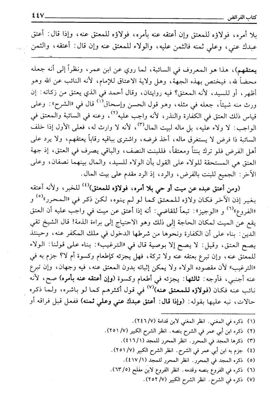 ـــــــــــــــــــــــــــــQيُعْتِقُهُمْ) هَذَا هُوَ الْمَعْرُوفُ فِي السَّائِبَةِ، لِمَا رُوِيَ عَنِ ابْنِ عُمَرَ، وَنَظَرًا إِلَى أَنَّهُ جَعَلَهُ مَحْضًا لِلَّهِ، فَيَخْتَصُّ بِهَذِهِ الْجِهَةِ، وَهَلْ وِلَايَةُ الْإِعْتَاقِ لِلْإِمَامِ؛ لِأَنَّهُ النَّائِبُ عَنِ اللَّهِ، وَهُوَ أَظْهَرُ، أَوْ لِلسَّيِّدِ؛ لِأَنَّهُ الْمُعْتِقُ؟ فِيهِ رِوَايَتَانِ، وَقَالَ أَحْمَدُ فِي الَّذِي يُعْتِقُ مِنْ زَكَاتِهِ: إِنْ وَرِثَ مِنْهُ شَيْئًا، جَعْلَهُ فِي مِثْلِهِ، وَهُوَ قَوْلُ الْحَسَنِ، وَإِسْحَاقَ، قَالَ فِي الشَّرْحِ: وَعَلَى قِيَاسِ ذَلِكَ الْعِتْقُ فِي الْكَفَّارَةِ وَالنَّذْرُ؛ لِأَنَّهُ وَاجِبٌ عَلَيْهِ، وَعَنْهُ فِي السَّائِبَةِ وَالْمُعْتَقِ فِي الْوَاجِبِ: لَا وَلَاءَ عَلَيْهِ، بَلْ مَالُهُ لِبَيْتِ الْمَالِ؛ لِأَنَّهُ لَا وَارِثَ لَهُ، فَعَلَى الْأَوَّلِ إِذَا خَلَّفَ السَّائِبَةُ ذَا فَرْضٍ، لَا يَسْتَغْرِقُ مَالَهُ، أَخَذَ فَرْضَهُ، وَاشْتَرَى بِبَاقِيهِ رِقَابًا يُعْتِقُهُمْ، وَلَا يُرَدُّ عَلَى أَهْلِ الْفَرْضِ، فَلَوْ تَرَكَ بِنْتًا وَمُعْتِقًا، فَلِلْبِنْتِ النِّصْفُ، وَالْبَاقِي فِي الْعِتْقِ، إِذْ جِهَةُ الْعِتْقِ هِيَ الْمُسْتَحِقَّةُ لِلْوَلَاءِ عَلَى الْقَوْلِ بِأَنَّ الْوَلَاءَ لِلسَّيِّدِ، وَالْمَالُ بَيْنَهُمَا نِصْفَانِ، وَعَلَى الْآخَرِ: الْجَمِيعُ لِلْبِنْتِ بِالْفَرْضِ وَالرَّدِّ، إِذِ الرَّدُّ مُقَدَّمٌ عَلَى بَيْتِ الْمَالِ.