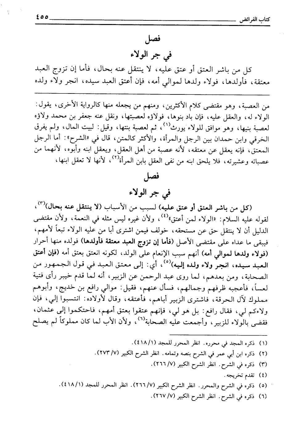 فِي جَرِّ الْوَلَاءِ (كُلُّ مَنْ بَاشَرَ الْعِتْقَ أَوْ عَتَقَ عَلَيْهِ) لِسَبَبٍ مِنَ الْأَسْبَابِ (لَا يَنْتَقِلُ عَنْهُ بِحَالٍ) لِقَوْلِهِ - عَلَيْهِ السَّلَامُ -: «الْوَلَاءُ لِمَنْ أَعْتَقَ» ، وَلِأَنَّ غَيْرَهُ لَيْسَ مِثْلَهُ فِي النِّعْمَةِ، وَلِأَنَّ مُقْتَضَى الدَّلِيلِ أَنْ لَا يَنْتَقِلَ حَقٌّ عَنْ مُسْتَحَقِّهِ، خُولِفَ فِيمَنِ اشْتَرَى أَبَا مَنْ عَلَيْهِ الْوَلَاءُ تَبَعًا لِأُمِّهِمْ، فَيَبْقَى مَا عَدَاهُ عَلَى مُقْتَضَى الْأَصْلِ (فَأَمَّا إِنْ تَزَوَّجَ الْعَبْدُ مُعْتَقَةً فَأَوْلَدَهَا) فَوَلَدُهُ مِنْهَا أَحْرَارٌ (فَوَلَاءُ وَلَدِهَا لِمَوَالِي أُمِّهِ) لِأَنَّهُمْ سَبَبُ الْإِنْعَامِ عَلَى الْوَلَدِ؛ لِكَوْنِهِ انْعَتَقَ بِعِتْقِ أُمِّهِ (فَإِنْ أَعْتَقَ الْعَبْدَ سَيِّدُهُ، انْجَرَّ وَلَاءُ وَلَدِهِ إِلَيْهِ) أَيْ: إِلَى مُعْتِقِ الْعَبْدِ، فِي قَوْلِ الْجُمْهُورِ مِنَ الصَّحَابَةِ، وَمَنْ بَعْدَهُمْ، لِمَا رَوَى عَبْدُ الرَّحْمَنِ عَنِ الزُّبَيْرِ، أَنَّهُ لَمَّا قَدِمَ خَيْبَرَ رَأَى فِتْيَةً لُعْسًا، فَأَعْجَبَهُ ظُرْفُهُمْ وَجَمَالُهُمْ، فَسَأَلَ عَنْهُمْ، فَقِيلَ: مَوَالِي رَافِعِ بْنِ خُدَيْجٍ، وَأَبُوهُمْ مَمْلُوكٌ لِآلِ الْحُرَقَةِ، فَاشْتَرَى الزُّبَيْرُ أَبَاهُمْ، فَأَعْتَقَهُ، وَقَالَ لِأَوْلَادِهِ: انْتَسِبُوا إِلَيَّ، فَإِنَّ وَلَاءَكُمْ لِي، فَقَالَ رَافِعٌ: بَلْ هُوَ لِي، فَإِنَّهُمْ عَتَقُوا بِعِتْقِ أُمِّهِمْ، فَاحْتَكَمُوا إِلَى عُثْمَانَ، فَقَضَى بِالْوَلَاءِ لِلزُّبَيْرِ، وَأَجْمَعَتْ عَلَيْهِ الصَّحَابَةُ، وَلِأَنَّ الْأَبَ لَمَّا كَانَ مَمْلُوكًا لَمْ يَصْلُحْ