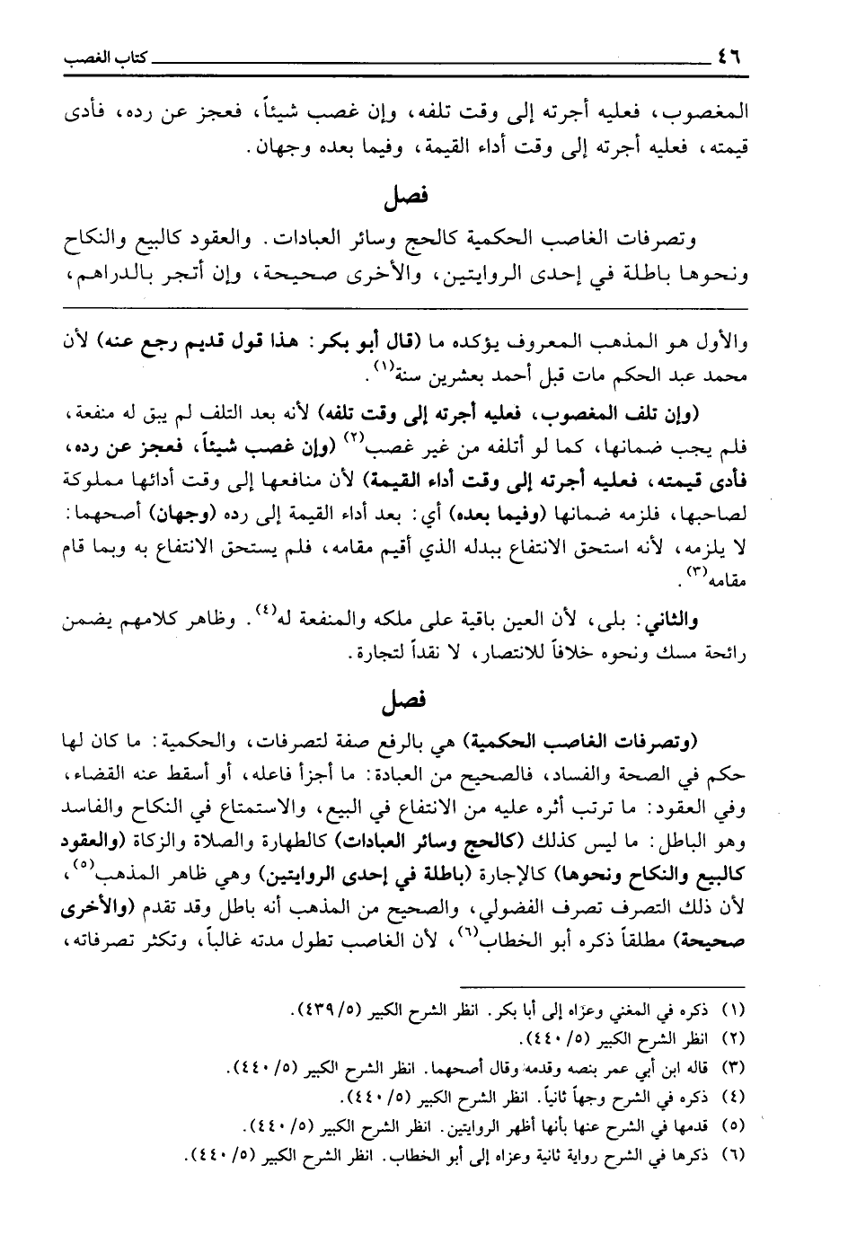 فَصْلٌ (وَتَصَرُّفَاتُ الْغَاصِبِ الْحُكْمِيَّةُ) هِيَ بِالرَّفْعِ صِفَةٌ لِتَصَرُّفَاتِ، وَالْحُكْمِيَّةُ: مَا كَانَ لَهَا حُكْمٌ فِي الصِّحَّةِ وَالْفَسَادِ، فَالصَّحِيحُ مِنَ الْعِبَادَةِ مَا أَجَزَأَ فَاعِلُهُ أَوْ أَسْقَطَ عَنْهُ الْقَضَاءَ، وَفِي الْعُقُودِ مَا تَرَتَّبَ أَثَرُهُ عَلَيْهِ مِنَ الِانْتِفَاعِ فِي الْبَيْعِ وَالِاسْتِمْتَاعِ فِي النِّكَاحِ، وَالْفَاسِدُ وَهُوَ الْبَاطِلُ مَا لَيْسَ كَذَلِكَ (كَالْحَجِّ وَسَائِرِ الْعِبَادَاتِ) كَالطَّهَارَةِ، وَالصَّلَاةِ وَالزَّكَاةِ (وَالْعُقُودِ كَالْبَيْعِ، وَالنِّكَاحِ، وَنَحْوِهَا) كَالْإِجَارَةِ (بَاطِلَةٌ فِي إِحْدَى الرِّوَايَتَيْنِ) وَهِيَ ظَاهِرُ الْمَذْهَبِ؛ لِأَنَّ ذَلِكَ التَّصَرُّفَ تَصَرُّفُ الْفُضُولِيِّ، وَالصَّحِيحُ مِنَ الْمَذْهَبِ أَنَّهُ بَاطِلٌ، وَقَدْ تَقَدَّمَ (وَالْأُخْرَى صَحِيحَةٌ) مُطْلَقًا، ذَكَرَهُ أَبُو الْخَطَّابِ؛ لِأَنَّ الْغَاصِبَ تَطُولُ مُدَّتُهُ غَالِبًا، وَتَكْثُرُ تَصَرُّفَاتُهُ،