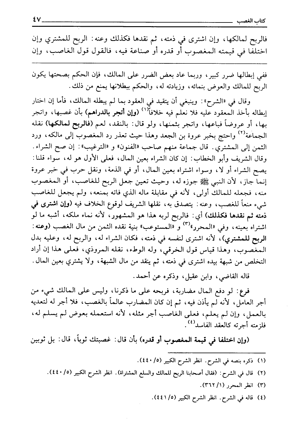 ـــــــــــــــــــــــــــــQفَفِي إِبْطَالِهَا ضَرَرٌ كَبِيرٌ، وَرُبَّمَا عَادَ بَعْضُ الضَّرَرِ عَلَى الْمَالِكِ، فَإِنَّ الْحُكْمَ بِصِحَّتِهَا يَكُونُ الرِّبْحُ لِلْمَالِكِ وَالْعِوَضُ بِنَمَائِهِ وَزِيَادَتِهِ لَهُ، وَالْحُكْمُ بِبُطْلَانِهَا يَمْنَعُ مِنْ ذَلِكَ، وَقَالَ فِي " الشَّرْحِ ": وَيَنْبَغِي أَنْ يُتَقَيَّدَ فِي الْعُقُودِ بِمَا لَمْ يُبْطِلْهُ الْمَالِكُ، فَأَمَّا إِنِ اخْتَارَ إِبْطَالَهُ بِأَخْذِ الْمَعْقُودِ عَلَيْهِ فَلَا نَعْلَمُ فِيهِ خِلَافًا (وَإِنِ اتَّجَرَ بِالدَّرَاهِمِ) بِأَنْ غَصَبَهَا وَاتَّجَرَ بِهَا، أَوْ عُرُوضًا فَبَاعَهَا وَاتَّجَرَ بِثَمَنِهَا، وَلَوْ قَالَ: بِالنَّقْدِ، لَعَمَّ (فَالرِّبْحُ لِمَالِكِهَا) نَقَلَهُ الْجَمَاعَةُ، وَاحْتُجَّ بِخَبَرِ عُرْوَةَ بْنِ الْجَعْدِ، وَهَذَا حَيْثُ تَعَذَّرَ رَدُّ الْمَغْصُوبِ إِلَى مَالِكِهِ وَرَدُّ الثَّمَنِ إِلَى الْمُشْتَرِي، قَالَ جَمَاعَةٌ مِنْهُمْ صَاحِبُ " الْفُنُونِ "، وَ " التَّرْغِيبِ ": إِنْ صَحَّ الشِّرَاءُ، وَقَالَ الشَّرِيفُ وَأَبُو الْخَطَّابِ: إِنْ كَانَ الشِّرَاءُ بِعَيْنِ الْمَالِ فَعَلَىِ الْأَوَّلِ هُوَ لَهُ، سَوَاءٌ قُلْنَا: يَصِحُّ الشِّرَاءُ أَوْ لَا، وَسَوَاءٌ اشْتَرَاهُ بِعَيْنِ الْمَالِ، أَوْ فِي الذِّمَّةِ، وَنَقَلَ حَرْبٌ فِي خَبَرِ عُرْوَةَ إِنَّمَا جَازَ؛ لِأَنَّ النَّبِيَّ - صَلَّى اللَّهُ عَلَيْهِ وَسَلَّمَ - جَوَّزَهُ لَهُ، وَحَيْثُ تَعَيَّنَ جَعْلُ الرِّبْحِ لِلْغَاصِبِ أَوِ الْمَغْصُوبِ مِنْهُ فَجَعْلُهُ لِلْمَالِكِ أَوْلَى؛ لِأَنَّهُ فِي مُقَابَلَةِ مَالِهِ الَّذِي فَاتَهُ بِمَنْعِهِ، وَلَمْ يُجْعَلْ لِلْغَاصِبِ شَيْءٌ مَنْعًا لِلْغَصْبِ، وَعَنْهُ: يَتَصَدَّقُ بِهِ، نَقَلَهَا الشَّرِيفُ لِوُقُوعِ الْخِلَافِ فِيهِ (وَإِنِ اشْتَرَى فِي ذِمَّتِهِ ثُمَّ نَقَدَهَا فَكَذَلِكَ) أَيْ، فَالرِّبْحُ لِرَبِّهِ، هَذَا هُوَ الْمَشْهُورُ؛ لِأَنَّهُ نَمَاءُ مِلْكِهِ، أَشْبَهَ مَا لَوِ اشْتَرَاهُ بِعَيْنِهِ، وَفِي " الْمُحَرَّرِ "، وَ " الْمُسْتَوْعِبِ " بِنِيَّةِ نَقْدِهِ الثَّمَنَ مِنْ مَالِ الْغَصْبِ (وَعَنْهُ: الرِّبْحُ لِلْمُشْتَرِي) لِأَنَّهُ اشْتَرَى لِنَفْسِهِ فِي ذِمَّتِهِ، فَكَانَ الشِّرَاءُ لَهُ، وَالرِّبْحُ لَهُ، وَعَلَيْهِ بَدَلُ الْمَغْصُوبِ، وَهَذَا قِيَاسُ قَوْلِ الْخِرَقِيِّ، وَلَهُ الْوَطْءُ، نَقَلَهُ الْمَرُّوذِيُّ، فَعَلَى هَذَا إِنْ أَرَادَ التَّخَلُّصَ مِنْ شُبْهَةٍ بِيَدِهِ، اشْتَرَى فِي ذِمَّتِهِ، ثُمَّ يَنْقُدُ مِنْ مَالِ الشُّبْهَةِ، وَلَا يَشْتَرِي بِعَيْنِ الْمَالِ. قَالَهُ الْقَاضِي، وَابْنُ عَقِيلٍ، وَذَكَرَهُ عَنْ أَحْمَدَ.
