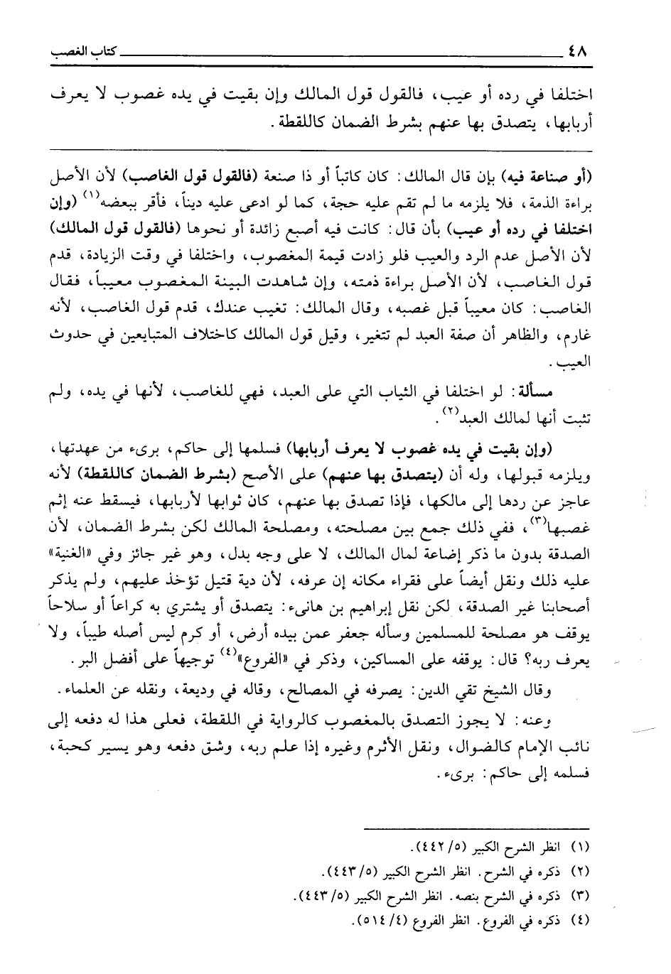 اخْتَلَفَا فِي رَدِّهِ أَوْ عَيْبٍ فَالْقَوْلُ قَوْلُ الْمَالِكِ، وَإِنْ بَقِيَتْ فِي يَدِهِ غَصُوبٌ لَا يَعْرِفُ أَرْبَابَهَا، يتَصَدَّقَ بِهَا عَنْهُمْ بِشَرْطِ الضَّمَانِ كَاللُّقَطَةِ.
