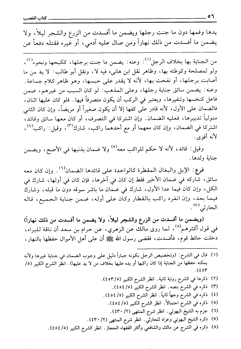 يَدُهَا وَفَمُهَا دُونَ مَا جَنَتْ رِجْلُهَا، وَيَضْمَنُ مَا أَفْسَدَتْ مِنَ الزَّرْعِ وَالشَّجَرِ لَيْلًا، وَلَا يَضْمَنُ مَا أَفْسَدَتْ مِنْ ذَلِكَ نَهَارًا