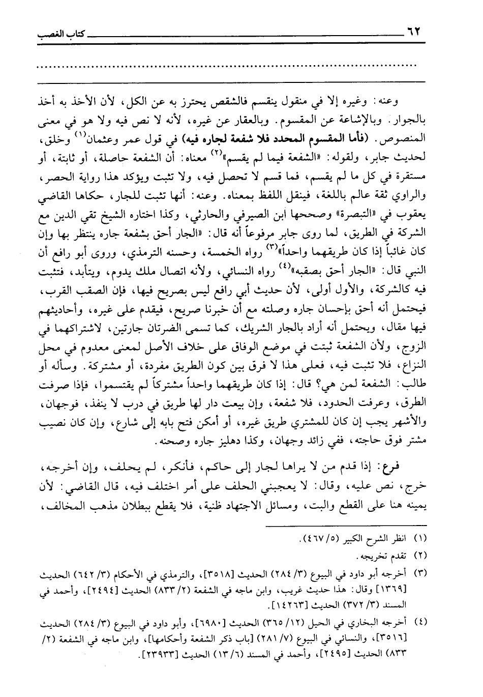 ـــــــــــــــــــــــــــــQوَعَنْهُ وَغَيْرِهِ: إِلَّا فِي مَنْقُولٍ يَنْقَسِمُ، فَالشِّقْصُ يُحْتَرَزُ بِهِ عَنِ الْكُلِّ؛ لِأَنَّ الْأَخْذَ بِهِ أَخْذٌ بِالْجِوَارِ، وَبِالْإِشَاعَةِ عَنِ الْمَقْسُومِ، وَبِالْعَقَارِ عَنْ غَيْرِهِ؛ لِأَنَّهُ لَا نَصَّ فِيهِ وَلَا هُوَ فِي مَعْنَى الْمَنْصُوصِ (فَأَمَّا الْمَقْسُومُ الْمُحَدَّدُ فَلَا شُفْعَةَ لِجَارِهِ فِيهِ) فِي قَوْلِ عُمَرَ، وَعُثْمَانَ، وَخَلْقٍ لِحَدِيثِ جَابِرٍ، وَلِقَوْلِهِ: «الشُّفْعَةُ فِيمَا لَمْ يُقْسَمْ» مَعْنَاهُ أَنَّ الشُّفْعَةَ حَاصِلَةٌ، أَوْ ثَابِتَةٌ، أَوْ مُسْتَقِرَّةٌ فِي كُلِّ مَا لَمْ يُقْسَمْ، فَمَا قُسِمَ لَا تَحْصُلُ فِيهِ، وَلَا تَثْبُتُ، وَيُؤَكِّدُ هَذَا رِوَايَةُ الْحَصْرِ، وَالرَّاوِي ثِقَةٌ عَالِمٌ بِاللُّغَةِ، فَيَنْقِلُ اللَّفْظَ بِمَعْنَاهُ، وَعَنْهُ: أَنَّهَا تَثْبُتُ لِلْجَارِ، حَكَاهَا الْقَاضِي يَعْقُوبُ فِي " التَّبْصِرَةِ "، وَصَحَّحَهَا ابْنُ الصَّيْرَفِيِّ، وَالْحَارِثِيُّ، وَكَذَا اخْتَارَهُ الشَّيْخُ تَقِيُّ الدِّينِ مَعَ الشَّرِكَةِ فِي الطَّرِيقِ لِمَا رَوَى جَابِرٌ مَرْفُوعًا أَنَّهُ قَالَ: «الْجَارُ أَحَقُّ بِشُفْعَةِ جَارِهِ يُنْتَظَرُ بِهَا وَإِنْ كَانَ غَائِبًا إِذَا كَانَ طَرِيقُهُمَا وَاحِدًا» ، رَوَاهُ الْخَمْسَةُ، وَحَسَّنَهُ التِّرْمِذِيُّ. وَرَوَى أَبُو رَافِعٍ أَنَّ النَّبِيَّ قَالَ: «الْجَارُ أَحَقُّ بِصَقَبِهِ» ، رَوَاهُ النَّسَائِيُّ.