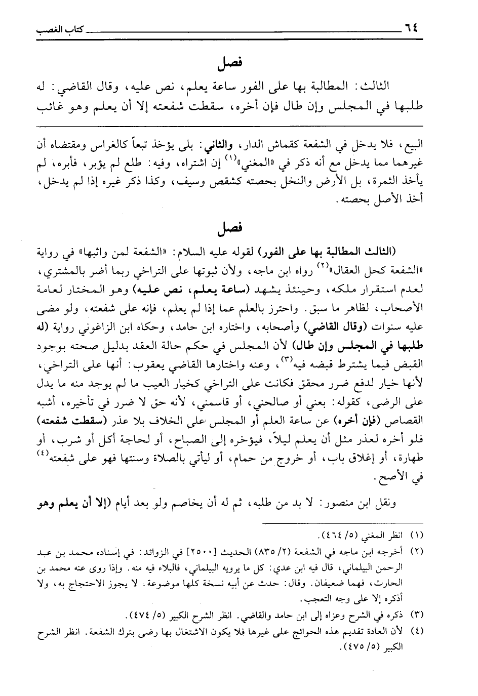 فَصْلٌ (الثَّالِثُ الْمُطَالَبَةُ بِهَا عَلَى الْفَوْرِ) لِقَوْلِهِ - عَلَيْهِ السَّلَامُ -: «الشُّفْعَةُ لِمَنْ وَاثَبَهَا» ، فِي رِوَايَةٍ: «الشُّفْعَةُ كَحَلِّ الْعِقَالِ» رَوَاهُ ابْنُ مَاجَهْ، وَلِأَنَّ ثُبُوتَهَا عَلَى التَّرَاخِي رُبَّمَا أَضَرَّ بِالْمُشْتَرِي لِعَدَمِ اسْتِقْرَارِ مِلْكِهِ، وَحِينَئِذٍ يُشْهِدُ (سَاعَةَ يَعْلَمُ، نَصَّ عَلَيْهِ) وَهُوَ الْمُخْتَارُ لِعَامَّةِ الْأَصْحَابِ لِظَاهِرِ مَا سَبَقَ، وَاحْتَرَزَ بِالْعِلْمِ عَمَّا إِذَا لَمْ يَعْلَمْ، فَإِنَّهُ عَلَى شُفْعَتِهِ، وَلَوْ مَضَى عَلَيْهِ سَنَوَاتٌ (وَقَالَ الْقَاضِي) وَأَصْحَابُهُ، وَاخْتَارَهُ ابْنُ حَامِدٍ، وَحَكَاهُ ابْنُ الزَّاغُونِيِّ رِوَايَةً (لَهُ طَلَبُهَا فِي الْمَجْلِسِ وَإِنْ طَالَ) لِأَنَّ الْمَجْلِسَ فِي حُكْمِ حَالَةِ الْعَقْدِ، بِدَلِيلِ صِحَّتِهِ بِوُجُودِ الْقَبْضِ فِيمَا يُشْتَرَطُ قَبْضُهُ فِيهِ، وَعَنْهُ وَاخْتَارَهَا الْقَاضِي يَعْقُوبُ: أَنَّهَا عَلَى التَّرَاخِي؛ لِأَنَّهَا خِيَارٌ لِدَفْعِ ضَرَرٍ مُحَقَّقٍ، فَكَانَتْ عَلَى التَّرَاخِي كَخِيَارِ الْعَيْبَ، مَا لَمْ يُوجَدْ مِنْهُ مَا يَدُلُّ عَلَى الرِّضَى، كَقَوْلِهِ: بِعْنِي، أَوْ صَالِحْنِي، أَوْ قَاسِمْنِي؛ لِأَنَّهُ حَقٌّ لَا ضَرَرَ فِي تَأْخِيرِهِ، أَشْبَهَ الْقِصَاصَ (فَإِنْ أَخَّرَهُ) عَنْ سَاعَةِ الْعِلْمِ، أَوِ الْمَجْلِسِ - عَلَى الْخِلَافِ - بِلَا عُذْرٍ (سَقَطَتْ شُفْعَتُهُ) فَلَوْ أَخَّرَهُ لِعُذْرٍ مِثْلِ أَنْ يَعْلَمَ لَيْلًا، فَيُؤَخِّرَهُ إِلَى الصَّبَاحِ، أَوْ لِحَاجَةِ أَكْلٍ، أَوْ شُرْبٍ، أَوْ طَهَارَةٍ، أَوْ إِغْلَاقِ بَابٍ، أَوْ خُرُوجٍ مِنْ حَمَّامٍ، أَوْ لِيَأْتِيَ بِالصَّلَاةِ وَسُنَّتِهَا، فَهُوَ عَلَى شُفْعَتِهِ فِي الْأَصَحِّ.