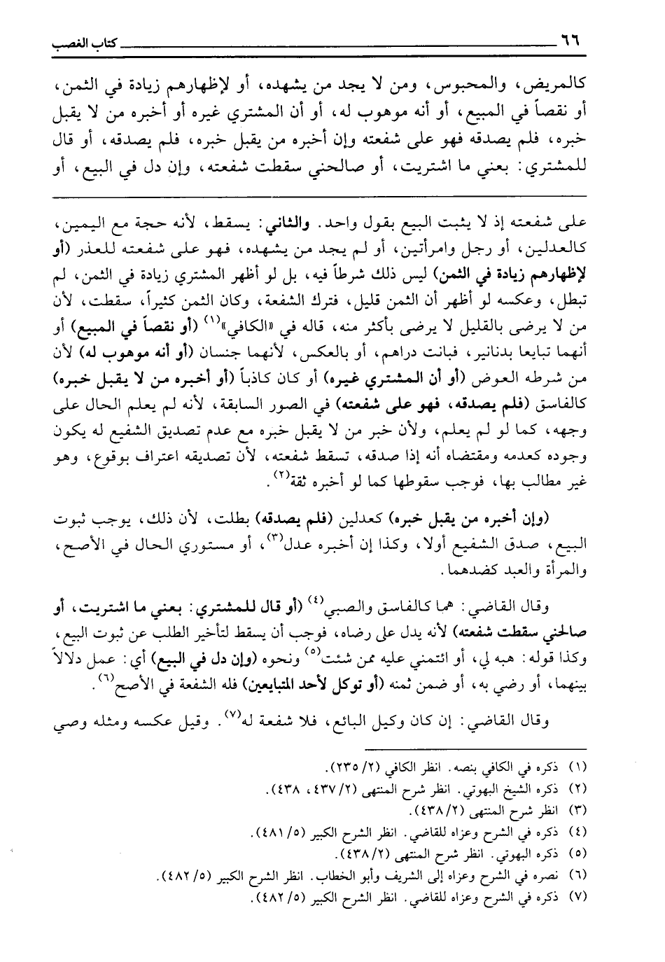 ـــــــــــــــــــــــــــــQعَلَى شُفْعَتِهِ، إِذْ لَا يَثْبُتُ الْبَيْعُ بِقَوْلِ وَاحِدٍ. وَالثَّانِي: يَسْقُطُ؛ لِأَنَّهُ حُجَّةٌ مَعَ الْيَمِينِ كَالْعَدْلَيْنِ، أَوْ رَجُلٍ وَامْرَأَتَيْنِ، أَوْ لَمْ يَجِدْ مَنْ يُشْهِدُهُ فَهُوَ عَلَى شُفْعَتِهِ لِلْعُذْرِ (أَوْ لِإِظْهَارِهِمْ زِيَادَةً فِي الثَّمَنِ) لَيْسَ ذَلِكَ شَرْطًا فِيهِ، بَلْ لَوْ أَظْهَرَ الْمُشْتَرِي زِيَادَةً فِي الثَّمَنِ لَمْ تَبْطُلْ، وَعَكْسُهُ لَوْ أَظْهَرَ أَنَّ الثَّمَنَ قَلِيلٌ، فَتَرَكَ الشُّفْعَةَ، وَكَانَ الثَّمَنُ كَثِيرًا سَقَطَتْ؛ لِأَنَّ مَنْ لَا يَرْضَى بِالْقَلِيلِ لَا يَرْضَى بِأَكْثَرَ مِنْهُ، قَالَهُ فِي " الْكَافِي " (أَوْ نَقْصًا فِي الْمَبِيعِ) أَوْ أَنَّهُمَا تَبَايَعَا بِدَنَانِيرَ، فَبَانَتْ دَرَاهِمَ، أَوْ بِالْعَكْسِ لِأَنَّهُمَا جِنْسَانِ (أَوْ أَنَّهُ مَوْهُوبٌ لَهُ) لِأَنَّ مِنْ شَرْطِهِ الْعِوَضَ (أَوْ أَنَّ الْمُشْتَرِيَ غَيْرُهُ) أَوْ كَانَ كَاذِبًا (أَوْ أَخْبَرَهُ مَنْ لَا يُقْبَلُ خَبَرُهُ) كَالْفَاسِقِ (فَلَمْ يُصَدِّقْهُ فَهُوَ عَلَى شُفْعَتِهِ) فِي الصُّوَرِ السَّابِقَةِ؛ لِأَنَّهُ لَمْ يَعْلَمِ الْحَالَ عَلَى وَجْهِهِ كَمَا لَوْ لَمْ يَعْلَمْ، وَلِأَنَّ خَبَرَ مَنْ لَا يُقْبَلُ خَبَرُهُ مَعَ عَدَمِ تَصْدِيقِ الشَّفِيعِ لَهُ، يَكُونُ وُجُودُهُ كَعَدَمِهِ، وَمُقْتَضَاهُ أَنَّهُ إِذَا صَدَّقَهُ تَسْقُطُ شُفْعَتُهُ؛ لِأَنَّ تَصْدِيقَهُ اعْتِرَافٌ بِوُقُوعٍ، وَهُوَ غَيْرُ مُطَالَبٍ بِهَا؛ فَوَجَبَ سُقُوطُهَا كَمَا لَوْ أَخْبَرَهُ ثِقَةٌ.