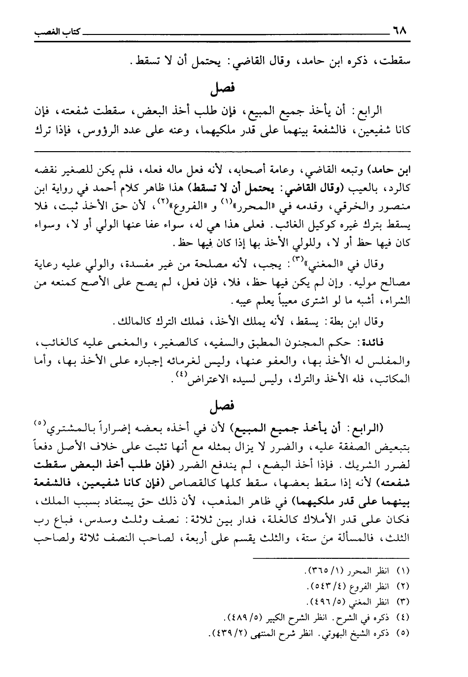 فَصْلٌ (الرَّابِعُ: أَنْ يَأْخُذَ جَمِيعَ الْمَبِيعِ) لِأَنَّ فِي أَخْذِهِ بَعْضَهُ إِضْرَارًا بِالْمُشْتَرِي بِتَبْعِيضِ الصَّفْقَةِ عَلَيْهِ، وَالضَّرَرُ لَا يُزَالُ بِمِثْلِهِ مَعَ أَنَّهَا تَثْبُتُ عَلَى خِلَافِ الْأَصْلِ دَفْعًا لِضَرَرِ الشَّرِيكِ، فَإِذَا أُخِذَ الْبَعْضُ لَمْ يَنْدَفِعِ الضَّرَرُ (فَإِنْ طَلَبَ أَخْذَ الْبَعْضِ سَقَطَتْ شُفْعَتُهُ) لِأَنَّهُ إِذَا سَقَطَ بَعْضُهَا سَقَطَ كُلُّهَا كَالْقِصَاصِ (فَإِنْ كَانَا شَفِيعَيْنِ فَالشُّفْعَةُ بَيْنَهُمَا عَلَى قَدْرِ مِلْكَيْهِمَا) فِي ظَاهِرِ الْمَذْهَبِ؛ لِأَنَّ ذَلِكَ حَقٌّ يُسْتَفَادُ بِسَبَبِ الْمِلْكِ، فَكَانَ عَلَى قَدْرِ الْأَمْلَاكِ كَالْغَلَّةِ، فَدَارَ بَيْنَ ثَلَاثَةٍ: نِصْفٌ، وَثُلُثٌ، وَسُدُسٌ، فَبَاعَ رَبُّ الثُّلُثِ، فَالْمَسْأَلَةُ مِنْ سِتَّةٍ، وَالثُّلُثُ يُقَسَّمُ عَلَى أَرْبَعَةٍ، لِصَاحِبِ النِّصْفِ ثَلَاثَةٌ، وَلِصَاحِبِ