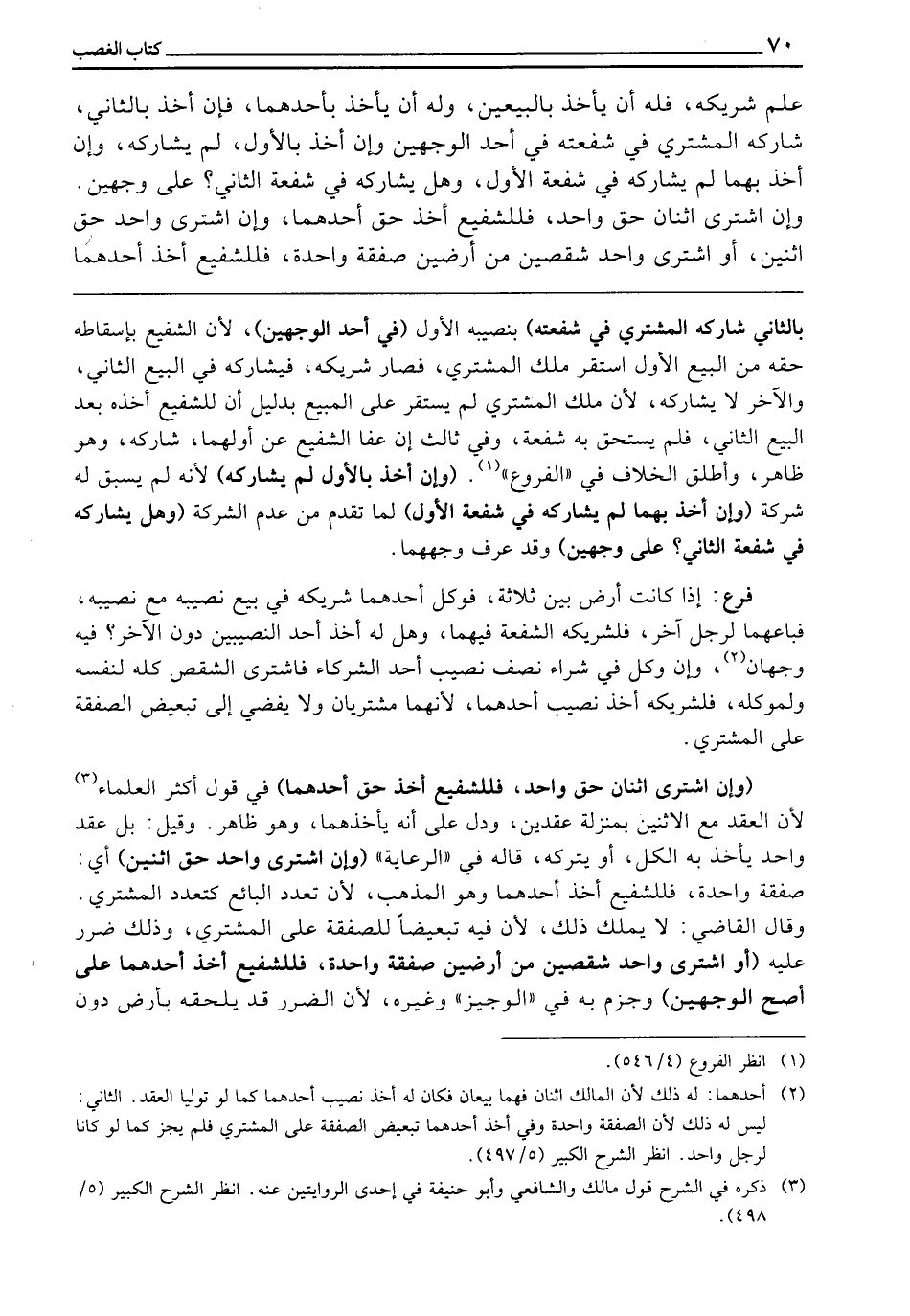 (وَإِنِ اشْتَرَى اثْنَانِ حَقَّ وَاحِدٍ، فَلِلشَّفِيعِ أَخْذُ حَقِّ أَحَدِهِمَا) فِي قَوْلِ أَكْثَرِ الْعُلَمَاءِ؛ لِأَنَّ الْعَقْدَ مَعَ الِاثْنَيْنِ بِمَنْزِلَةِ عَقْدَيْنِ، وَدَلَّ عَلَى أَنَّهُ يَأْخُذُهُمَا، وَهُوَ ظَاهِرٌ، وَقِيلَ: بَلْ عَقْدٌ وَاحِدٌ يَأْخُذُ بِهِ الْكُلَّ، أَوْ يَتْرُكُهُ، قَالَهُ فِي " الرِّعَايَةِ " (وَإِنِ اشْتَرَى وَاحِدٌ حَقَّ اثْنَيْنِ) أَيْ: صَفْقَةً وَاحِدَةً، فَلِلشَّفِيعِ أَخْذُ أَحَدِهِمَا، وَهُوَ الْمَذْهَبُ؛ لِأَنَّ تَعَدُّدَ الْبَائِعِ كَتَعَدُّدِ الْمُشْتَرِي، وَقَالَ الْقَاضِي: لَا يَمْلِكُ ذَلِكَ؛ لِأَنَّ فِيهِ تَبْعِيضًا لِلصَّفْقَةِ عَلَى الْمُشْتَرِي، وَذَلِكَ ضَرَرٌ عَلَيْهِ (أَوِ اشْتَرَى وَاحِدٌ شِقْصَيْنِ مِنْ أَرْضِينَ صَفْقَةً وَاحِدَةً، فَلِلشَّفِيعِ أَخْذُ أَحَدِهِمَا عَلَى أَصَحِّ الْوَجْهَيْنِ) وَجُزِمَ بِهِ فِي " الْوَجِيزِ " وَغَيْرِهِ؛ لِأَنَّ الضَّرَرَ قَدْ يَلْحَقُهُ بِأَرْضٍ دُونَ