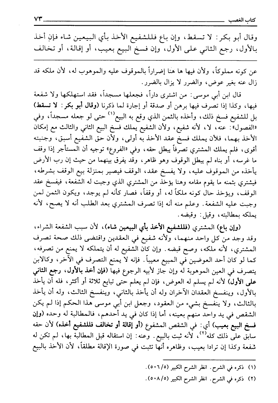 قَالَ ابْنُ أَبِي مُوسَى: مَنِ اشْتَرَى دَارًا فَجَعَلَهَا مَسْجِدًا، فَقَدِ اسْتَهْلَكَهَا وَلَا شُفْعَةَ فِيهَا، وَكَذَا إِذَا تَصَرَّفَ فِيهَا بِرَهْنٍ، أَوْ صَدَقَةٍ، أَوْ إِجَارَةٍ لِمَا ذَكَرْنَا (وَقَالَ أَبُو بَكْرٍ: لَا تَسْقُطُ) بَلْ لِلشَّفِيعِ فَسْخُ ذَلِكَ وَأَخْذُهُ بِالثَّمَنِ الَّذِي وَقَعَ بِهِ الْبَيْعُ، حَتَّى لَوْ جَعَلَهُ مَسْجِدًا، وَفِي " الْفُصُولِ ": عَنْهُ لَا؛ لِأَنَّهُ شَفِيعٌ، وَلِأَنَّ الشَّفِيعَ يَمْلِكُ فَسْخَ الْبَيْعِ الثَّانِي وَالثَّالِثِ مَعَ إِمْكَانِ الْأَخْذِ بِهِمَا، فَلِأَنْ يَمْلِكَ فَسْخَ عَقْدٍ الْأَخْذُ بِهِ أَوْلَى، وَلِأَنَّ حَقَّ الشَّفِيعِ أَسْبَقُ، وَجَنَبَتَهُ أَقْوَى فَلَمْ يَمْلِكِ الْمُشْتَرِي تَصَرُّفًا يُبْطِلُ حَقَّهُ، وَفِي " الْفُرُوعِ " تَوْجِيهٌ، أَنَّ الْمُسْتَأْجِرَ إِذَا وَقَفَ مَا غَرَسَهُ أَوْ بَنَاهُ لَمْ يُبْطِلِ الْوَقْفَ، وَهُوَ ظَاهِرٌ، وَقَدْ يُفَرَّقُ بَيْنَهُمَا مِنْ حَيْثُ إِنَّ رَبَّ الْأَرْضِ يَأْخُذُهُ مِنَ الْمَوْقُوفِ عَلَيْهِ، وَلَا يَفْسَخُ عَقْدَ الْوَقْفِ، فَيَصِيرُ بِمَنْزِلَةِ بَيْعِ الْوَقْفِ بِشَرْطِهِ، فَيَشْتَرِي بِثَمَنِهِ مَا يَقُومُ مَقَامَهُ، وَهُنَا يُؤْخَذُ مِنَ الْمُشْتَرِي الَّذِي وَجَبَتْ لَهُ الشُّفْعَةُ، فَيُفْسَخُ عَقْدُ الْوَقْفِ، وَيُؤْخَذُ حَالُ كَوْنِهِ مِلْكًا لَهُ أَوْ وَقْفًا، فَصَارَ كَأَنَّهُ لَمْ يُوجَدْ، وَيَكُونُ الثَّمَنُ لِمَنْ وَجَبَتْ عَلَيْهِ الشُّفْعَةُ، وَعُلِمَ مِنْهُ أَنَّهُ إِذَا تَصَرَّفَ الْمُشْتَرِي بَعْدَ الطَّلَبِ أَنَّهُ لَا يَصِحُّ؛ لِأَنَّهُ يَمْلِكُهُ بِمُطَالَبَتِهِ، وَقِيلَ: وَقَبْضِهِ.