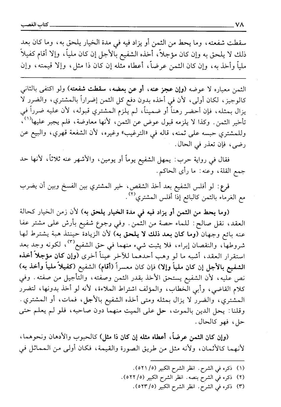 (وَمَا يُحَطُّ مِنَ الثَّمَنِ أَوْ يُزَادُ فِيهِ فِي مُدَّةِ الْخِيَارِ يَلْحَقُ بِهِ) لِأَنَّ زَمَنَ الْخِيَارِ كَحَالَةِ الْعَقْدِ، نَقَلَ صَالِح: لِلْمَاءِ حِصَّةٌ مِنَ الثَّمَنِ، وَفِي رُجُوعِ شَفِيعٍ بِأَرْشٍ عَلَى مُشْتَرٍ عَفَا عَنْهُ بَائِعٌ وَجْهَانِ (وَمَا كَانَ بَعْدَ ذَلِكَ لَا يَلْحَقُ بِهِ) لِأَنَّ الزِّيَادَةَ حِينَئِذٍ هِبَةٌ يُشْتَرَطُ لَهَا شُرُوطُهَا، وَالنُّقْصَانَ إِبْرَاءٌ، فَلَا يَثْبُتُ شَيْءٌ مِنْهُمَا فِي حَقِّ الشَّفِيعِ لِكَوْنِهِ وُجِدَ بَعْدَ اسْتِقْرَارِ الْعَقْدِ، أَشْبَهَ مَا لَوْ وَهَبَ أَحَدُهُمَا لِلْآخَرِ عَيْنًا أُخْرَى (وَإِنْ كَانَ مُؤَجَّلًا أَخَذَهُ الشَّفِيعُ بِالْأَجَلِ إِنْ كَانَ مَلِيًّا وَإِلَّا) فَإِنْ كَانَ مُعْسِرًا (أَقَامَ) الشَّفِيعُ (كَفِيلًا مَلِيًّا وَأَخَذَ بِهِ) نَصَّ عَلَيْهِ؛ لِأَنَّ الشَّفِيعَ يَسْتَحِقُّ الْأَخْذَ بِقَدَرِ الثَّمَنِ، وَصِفَتِهِ، وَالتَّأْجِيلُ مِنْ صِفَتِهِ، وَفِي كَلَامِ الْقَاضِي، وَأَبِي الْخَطَّابِ، وَالْمُؤَلِّفِ اشْتِرَاطُ الْمُلَاءَةِ؛ لِأَنَّهُ لَوْ أَخَذَ بِدُونِهَا لَتَضَرَّرَ الْمُشْتَرِي، وَالضَّرَرُ لَا يُزَالُ بِمِثْلِهِ، وَمَتَى أَخَذَهُ الشَّفِيعُ بِالْأَجَلِ، فَمَاتَ، أَوِ الْمُشْتَرِي، وَقُلْنَا: يَحِلُّ الدَّيْنُ بِالْمَوْتِ حَلَّ عَلَى الْمَيِّتِ مِنْهُمَا دُونَ صَاحِبِهِ، فَلَوْ لَمْ يَعْلَمْ حَتَّى حَلَّ فَهُوَ كَالْحَالِ.