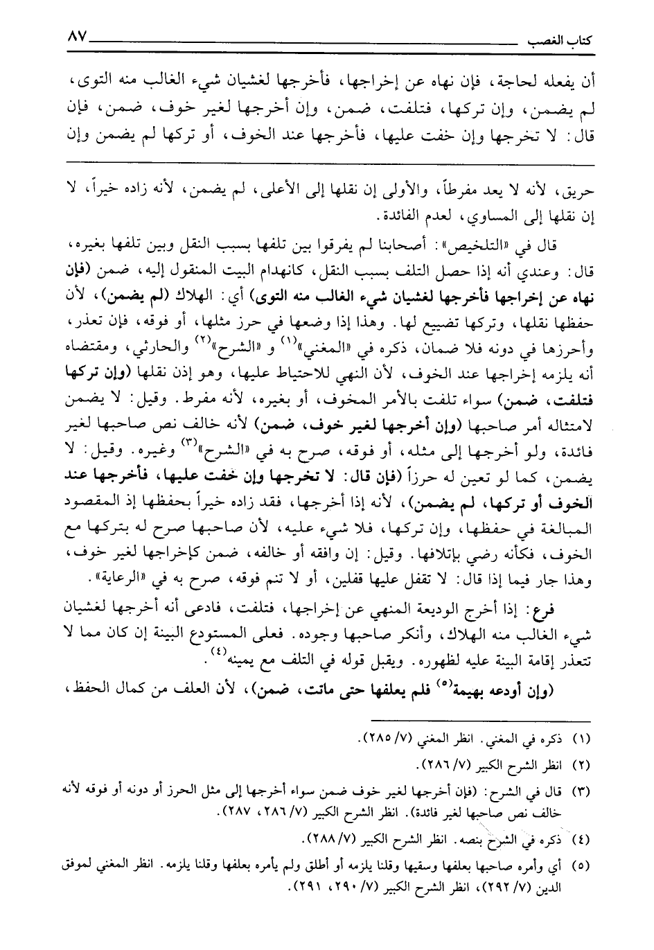 قَالَ فِي " التَّلْخِيصِ ": أَصْحَابُنَا لَمْ يُفَرِّقُوا بَيْنَ تَلَفِهَا بِسَبَبِ النَّقْلِ وَبَيْنَ تَلَفِهَا بِغَيْرِهِ، قَالَ: وَعِنْدِي أَنَّهُ إِذَا حَصَلَ التَّلَفُ بِسَبَبِ النَّقْلِ كَانْهِدَامِ الْبَيْتِ الْمَنْقُولِ إِلَيْهِ ضَمِنَ (فَإِنْ نَهَاهُ عَنْ إِخْرَاجِهَا فَأَخْرَجَهَا لِغَشَيَانِ شَيْءٍ الْغَالِبُ مِنْهُ التَّوَى) أَيْ: الْهَلَاكُ (لَمْ يَضْمَنْ) لِأَنَّ حِفْظَهَا نَقْلُهَا، وَتَرْكَهَا تَضْيِيعٌ لَهَا، وَهَذَا إِذَا وَضَعَهَا فِي حِرْزِ مِثْلِهَا أَوْ فَوْقِهِ، فَإِنْ تَعَذَّرَ وَأَحْرَزَهَا فِي دُونِهِ فَلَا ضَمَانَ، ذَكَرَهُ فِي " الْمُغْنِي "، وَ " الشَّرْحِ "، وَالْحَارِثِيُّ، وَمُقْتَضَاهُ أَنَّهُ يَلْزَمُهُ إِخْرَاجُهَا عِنْدَ الْخَوْفِ؛ لِأَنَّ النَّهْيَ لِلِاحْتِيَاطِ عَلَيْهَا، وَهُوَ إِذْنُ نَقْلِهَا (وَإِنْ تَرَكَهَا فَتَلِفَتْ ضَمِنَ) سَوَاءٌ تَلِفَتْ بِالْأَمْرِ الْمُخَوِّفِ أَوْ بَغِيرِهِ؛ لِأَنَّهُ مُفَرِّطٌ، وَقِيلَ: لَا يَضْمَنُ لِامْتِثَالِهِ أَمْرَ صَاحِبِهَا (وَإِنْ أَخْرَجَهَا لِغَيْرِ خَوْفٍ ضَمِنَ) لِأَنَّهُ خَالَفَ نَصَّ صَاحِبِهَا لِغَيْرِ فَائِدَةٍ، وَلَوْ أَخْرَجَهَا إِلَى مِثْلِهِ أَوْ فَوْقِهِ، صَرَّحَ بِهِ فِي " الشَّرْحِ " وَغَيْرِهِ، وَقِيلَ: لَا يَضْمَنُ كَمَا لَوْ تَعَيَّنَ لَهُ حِرْزًا (فَإِنْ قَالَ: لَا تُخْرِجْهَا وَإِنْ خِفْتَ عَلَيْهَا، فَأَخْرَجَهَا عِنْدَ الْخَوْفِ أَوْ تَرَكَهَا لَمْ يَضْمَنْ) لِأَنَّهُ إِذَا أَخْرَجَهَا فَقَدْ زَادَهُ خَيْرًا بِحِفْظِهَا إِذِ الْمَقْصُودُ الْمُبَالَغَةُ فِي حِفْظِهَا، وَإِنْ تَرَكَهَا فَلَا شَيْءَ عَلَيْهِ لِأَنَّ صَاحِبَهَا صَرَّحَ لَهُ بِتَرْكِهَا مَعَ الْخَوْفِ، فَكَأَنَّهُ رَضِيَ بِإِتْلَافِهَا، وَقِيلَ: إِنْ وَافَقَهُ أَوْ خَالَفَهُ ضَمِنَ كَإِخْرَاجِهَا لِغَيْرِ خَوْفٍ، وَهَذَا جَارٍ فِيمَا إِذَا قَالَ: لَا تَقْفِلْ عَلَيْهَا قُفْلَيْنِ، أَوْ لَا تَنَمْ فَوْقَهُ، صَرَّحَ بِهِ فِي " الرِّعَايَةِ ".