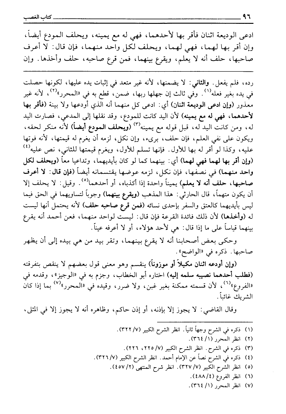 ـــــــــــــــــــــــــــــQرَدُّهُ فَلَمْ يَفْعَلْ، وَالثَّانِي لَا يَضْمَنُهَا؛ لِأَنَّهُ غَيْرُ مُتَعَدٍّ فِي إِثْبَاتِ يَدِهِ عَلَيْهَا، لِكَوْنِهَا حَصَلَتْ فِي يَدِهِ بِغَيْرِ فِعْلِهِ، وَفِي ثَالِثٍ إِنْ جَهِلَهَا رَبُّهَا ضَمِنَ، قُطِعَ بِهِ فِي " الْمُحَرَّرِ " لِأَنَّهُ غَيْرُ مَعْذُورٍ (وَإِنِ ادَّعَى الْوَدِيعَةَ اثْنَانِ) أَيِ ادَّعَى كُلٌّ مِنْهُمَا أَنَّهُ الَّذِي أَوْدَعَهَا وَلَا بَيِّنَةَ (فَأَقَرَّ بِهَا لِأَحَدِهِمَا فَهِيَ لَهُ مَعَ يَمِينِهِ) لِأَنَّ الْيَدَ كَانَتْ لِلْمُودَعِ وَقَدْ نَقَلَهَا إِلَى الْمُدَّعِي فَصَارَتِ الْيَدُ لَهُ، وَمَنْ كَانَتِ الْيَدُ لَهُ قُبِلَ قَوْلُهُ مَعَ يَمِينِهِ (وَيَحْلِفُ الْمُودِعُ أَيْضًا) لِأَنَّهُ مُنْكِرٌ لِحَقِّهِ، وَيَكُونُ عَلَى نَفْيِ الْعِلْمِ، فَإِنْ حَلَفَ بَرِئَ، وَإِنْ نَكَلَ لَزِمَهُ أَنْ يَغْرَمَ لَهُ قِيمَتَهَا؛ لِأَنَّهُ فَوَّتَهَا عَلَيْهِ، وَكَذَا لَوْ أَقَرَّ لَهُ بِهَا لِلْأَوَّلِ، فَإِنْهَا تُسَلَّمُ لِلْأَوَّلِ، وَيُغَرَّمُ قِيمَتُهَا لِلثَّانِي، نَصَّ عَلَيْهِ (وَإِنْ أَقَرَّ بِهَا لَهُمَا فَهِيَ لَهُمَا) أَيْ: بَيْنَهُمَا كَمَا لَوْ كَانَتْ بِأَيْدِيهِمَا، وَتَدَاعَيَا مَعًا (وَيُحْلَفُ لِكُلِّ وَاحِدٍ مِنْهُمَا) فِي نِصْفِهَا، فَإِنْ نَكَلَ لَزِمَهُ عِوَضُهَا، يَقْتَسِمَانِهِ أَيْضًا (فَإِنْ قَالَ: لَا أَعْرِفُ صَاحِبَهَا حَلَفَ أَنَّهُ لَا يَعْلَمُ) يَمِينًا وَاحِدَةً إِذَا أَكْذَبَاهُ، أَوْ أَحَدُهُمَا، وَقِيلَ: لَا يَحْلِفُ إِلَّا أَنْ يَكُونَ مُتَّهَمًا. قَالَ الْحَارِثِيُّ: هَذَا الْمَذْهَبُ (وَيُقْرَعُ بَيْنَهُمَا) وُجُوبًا لِتَسَاوِيهِمَا فِي الْحَقِّ فِيمَا لَيْسَ بِأَيْدِيهِمَا كَالْعِتْقِ وَالسَّفَرِ بِإِحْدَى نِسَائِهِ (فَمَنْ قَرَعَ صَاحِبَهُ حَلَفَ) لِأَنَّهُ يُحْتَمَلُ أَنَّهَا لَيْسَتْ لَهُ (وَأَخَذَهَا) لِأَنَّ ذَلِكَ فَائِدَةُ الْقُرْعَةِ، فَإِنْ قَالَ: لَيْسَتْ لِوَاحِدٍ مِنْهُمَا، فَعَنْ أَحْمَدَ أَنَّهُ يُقْرَعُ بَيْنَهُمَا قِيَاسًا عَلَى مَا إِذَا قَالَ: هِيَ لِأَحَدِ هَؤُلَاءِ، أَوْ لَا أَعْرِفُهُ عَيْنًا، وَحَكَى بَعْضُ أَصْحَابِنَا: أَنَّهُ لَا يُقْرَعُ بَيْنَهُمَا، وَتُقَرُّ بِيَدِ مَنْ هِيَ بِيَدِهِ إِلَى أَنْ يَظْهَرَ صَاحِبُهَا، ذَكَرَهُ فِي " الْوَاضِحِ ".