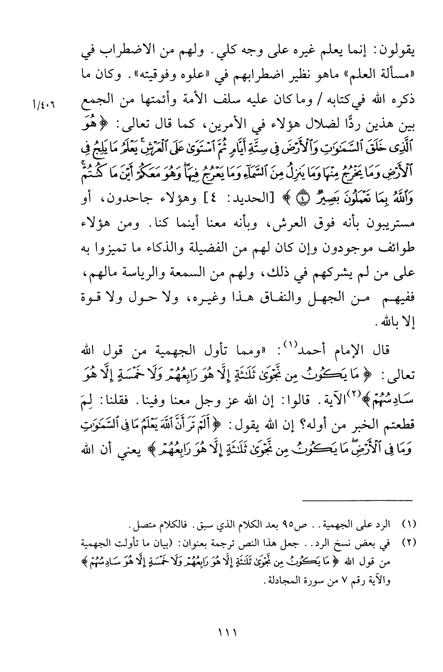 يقولون إنما يعلم غيره على وجه كلي ولهم من الاضطراب في مسألة العلم ماهو نظير اضطرابه في علوه وفوقيته وكان ما ذكره الله في كتابه وما كان عليه سلف الأمة وأئمتها من الجمع بين هذين ردًّا لضلال هؤلاء في الأمرين كما قال تعالى هُوَ الَّذِي خَلَقَ السَّمَاوَاتِ وَالْأَرْضَ فِي سِتَّةِ أَيَّامٍ ثُمَّ اسْتَوَى عَلَى الْعَرْشِ يَعْلَمُ مَا يَلِجُ فِي الْأَرْضِ وَمَا يَخْرُجُ مِنْهَا وَمَا يَنزِلُ مِنَ السَّمَاء وَمَا يَعْرُجُ فِيهَا وَهُوَ مَعَكُمْ أَيْنَ مَا كُنتُمْ وَاللَّهُ بِمَا تَعْمَلُونَ بَصِيرٌ {4} [الحديد 4] وهؤلاء جاحدون أو مستريبون بأنه فوق العرش وبأنه معنا أينما كنا ومن هؤلاء طوائف موجودون وإن كان لهم من الفضيلة والذكاء ما تميزوا به على من لم يشركهم في ذلك ولهم من السمعة والرياسة مالهم ففيهم من الجهل والنفاق هذا وغيره ولا حول ولا قوة إلا بالله قال الإمام أحمد ومما تأول الجهمية من قول الله تعالى مَا يَكُونُ مِن نَّجْوَى ثَلَاثَةٍ إِلَّا هُوَ رَابِعُهُمْ وَلَا خَمْسَةٍ إِلَّا هُوَ سَادِسُهُمْ الآية قالوا إن الله عز وجل معنا وفينا فقلنا لِمَ قطعتم الخبر من أوله إن الله يقول أَلَمْ تَرَ أَنَّ اللَّهَ يَعْلَمُ مَا فِي السَّمَاوَاتِ وَمَا فِي الْأَرْضِ مَا يَكُونُ مِن نَّجْوَى ثَلَاثَةٍ إِلَّا هُوَ رَابِعُهُمْ يعني أن الله