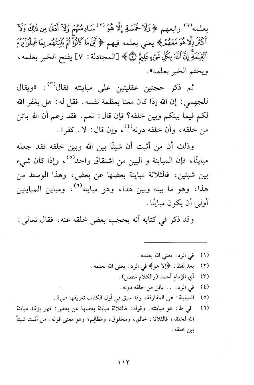 بعلمه رابعهم وَلَا خَمْسَةٍ إِلَّا هُوَ سَادِسُهُمْ وَلَا أَدْنَى مِن ذَلِكَ وَلَا أَكْثَرَ إِلَّا هُوَ مَعَهُمْ يعني بعلمه فيهم أَيْنَ مَا كَانُوا ثُمَّ يُنَبِّئُهُم بِمَا عَمِلُوا يَوْمَ الْقِيَامَةِ إِنَّ اللَّهَ بِكُلِّ شَيْءٍ عَلِيمٌ {7} [المجادلة 7] يفتح الخبر بعلمه ويختم الخبر بعلمه ثم ذكر حجتين عقليتين على مباينته فقال ويقال للجهمي إن الله إذا كان معنا بعظمة نفسه فقل له هل يغفر الله لكم فيما بينكم وبين خلقه فإن قال نعم فقد زعم أن الله بائن من خلقه وأن خلقه دونه وإن قال لا كفر وذلك أن من أثبت أن شيئًا بين الله وبين خلقه فقد جعله مباينًا فإن المباينة والبين من اشتقاق واحد وإذا كان شيء بين شيئين فالثلاثة مباينة بعضها عن بعض وهذا الوسط من هذا وهو ما بينه وبين هذا وهو مباينه ومباين المباينين أولى أن يكون مباينًا وقد ذكر في كتابه أنه يحجب بعض خلقه عنه فقال تعالى