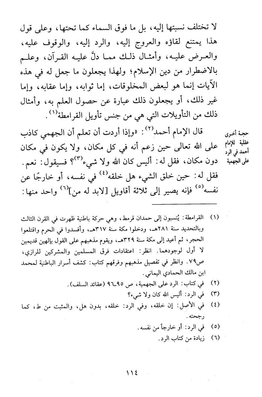 لا تختلف نسبتها إليه بل ما فوق السماء كما تحتها وعلى قول هذا يمتنع لقاؤه والعروج إليه والرد إليه والوقوف عليه والعرض عليه وأمثال ذلك مما دلَّ عليه القرآن وعلم بالاضطرار من دين الإسلام ولهذا يجعلون ما جعل له في هذه الآيات إنما هو لبعض المخلوقات إما ثوابه وإما عقابه وإما غير ذلك أو يجعلون ذلك عبارة عن حصول العلم به وأمثال ذلك من التأويلات التي هي من جنس تأويل القرامطة قال الإمام أحمد وإذا أردت أن تعلم أن الجهمي كاذب على الله تعالى حين زعم أنه في كل مكان ولا يكون في مكان دون مكان فقل له أليس كان الله ولا شيء فسيقول نعم فقل له حين خلق الشيء هل خلقه في نفسه أو خارجًا عن نفسه فإنه يصير إلى ثلاثة أقاويل لابد له من واحد منها