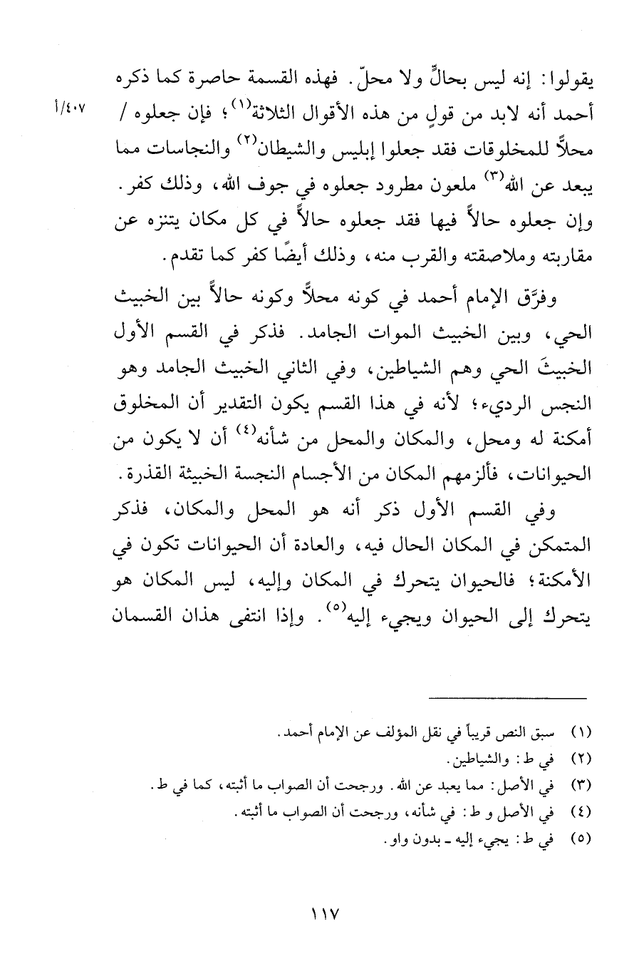 يقولوا إنه ليس بحالٍّ ولا محلّ فهذه القسمة حاصرة كما ذكره أحمد أنه لابد من قولٍ من هذه الأقوال الثلاثة فإن جعلوه محلاًّ للمخلوقات فقد جعلوا إبليس والشيطان والنجاسات مما يبعد عن الله ملعون مطرود جعلوه في جوف الله وذلك كفر وإن جعلوه حالاًّ فيها فقد جعلوه حالاًّ في كل مكان يتنزه عن مقاربته وملاصقته والقرب منه وذلك أيضًا كفر كما تقدم وفرَّق الإمام أحمد في كونه محلاًّ وكونه حالاًّ بين الخبيث والحي وبين الخبيث الموات الجامد فذكر في القسم الأول الخبيثَ الحي وهم الشياطين وفي الثاني الخبيث الجامد وهو النجس الرديء لأنه في هذا القسم يكون التقدير أن المخلوق أمكنة له ومحل والمكان المحل من شأنه أن لا يكون من الحيوانات فألزمهم المكان من الأجسام النجسة الخبيثة القذرة وفي القسم الأول ذكر أنه هو المحل والمكان فذكر المتمكن في المكان الحال فيه والعادة أن الحيوانات تكون في الأمكنة فالحيوان يتحرك في المكان وإليه ليس المكان هو يتحرك إلى الحيوان ويجيء إليه وإذا انتفى هذان القسمان