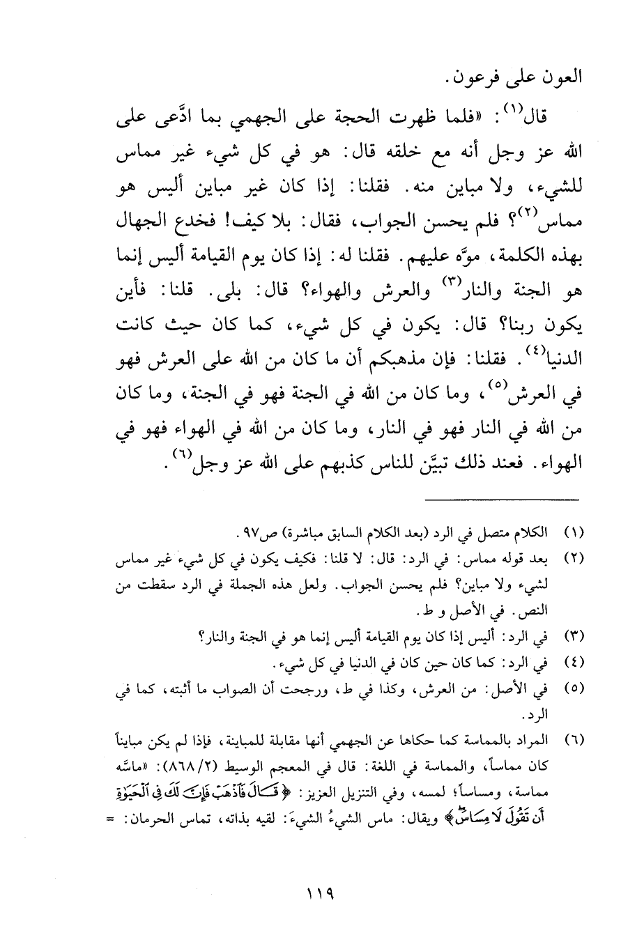 العون على فرعون قال فلما ظهرت الحجة على الجهمي بما ادَّعى على الله عز وجل أنه مع خلقه قال هو في كل شيء غير مماس للشيء ولا مباين منه فقلنا إذا كان غير مباين أليس هو مماس فلم يحسن الجواب فقال بلا كيف فخدع الجهال بهذه الكلمة موَّه عليهم فقلنا له إذا كان يوم القيامة أليس إنما هو الجنة والنار والعرش والهواء قال بلى قلنا فأين يكون ربنا قال يكون في كل شيء كما كان حيث كانت الدنيا فقلنا فإن مذهبكم أن ما كان من الله على العرش فهو في العرش وما كان من الله في الجنة فهم في الجنة وما كان من الله في النار فهو في النار وما كان من الله في الهواء فهو في الهواء فعند ذلك تبيَّن للناس كذبهم على الله عز وجل