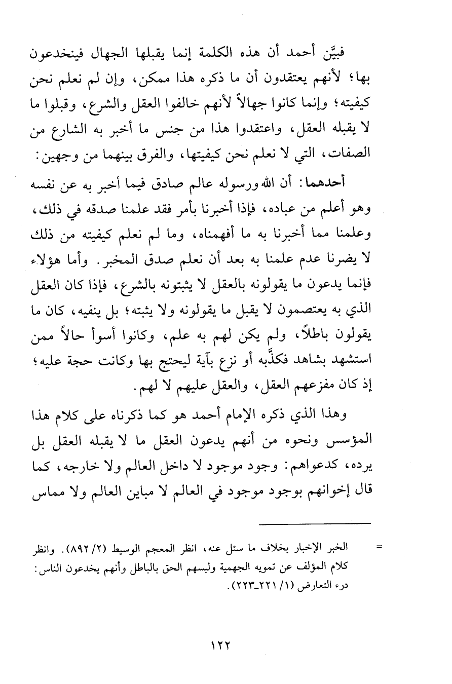 فبيَّن أحمد أن هذه الكلمة إنما يقبلها الجهال فينخدعون بها لأنهم يعتقدون أن ما ذكره هذا ممكن وإن لم نعلم نحن كيفيته وإنما كانوا جهالاً لأنهم خالفوا العقل والشرع وقبلوا ما لا يقبله العقل واعتقدوا هذا من جنس ما أخبر به الشارع من الصفات التي لا نعلم نحن كيفيتها والفرق بينهما من وجهين أحدهما أن الله ورسوله عالم صادق فيما أخبر به عن نفسه وهو أعلم من عباده فإذا أخبرنا بأمر فقد علمنا صدقه في ذلك وعلمنا مما أخبرنا به ما أفهمناه وما لم نعلم كيفيته من ذلك لا يضرنا عدم علمنا به بعد أن نعلم صدق المخبر وأما هؤلاء فإنما يدعون ما يقولونه بالعقل لا يثبتونه بالشرع فإذا كان العقل الذي به يعتصمون لا يقبل ما يقولونه ولا يثبته بل ينفيه كان ما يقولون باطلاً ولم يكن لهم به علم وكانوا أسوأ حالاً ممن استشهد بشاهد فكذَّبه أو نزع بآية ليحتج بها وكانت حجة عليه إذ كان مفزعهم العقل والعقل عليهم لا لهم وهذا الذي ذكره الإمام أحمد هو كما ذكرناه على كلام هذا المؤسس ونحوه من أنهم يدعمون العقل ما لا يقبله العقل بل يرده كدعواهم وجود موجود لا داخل العالم ولا خارجه كما قال إخوانهم بوجود موجود في العالم لا مباين العالم ول مماس