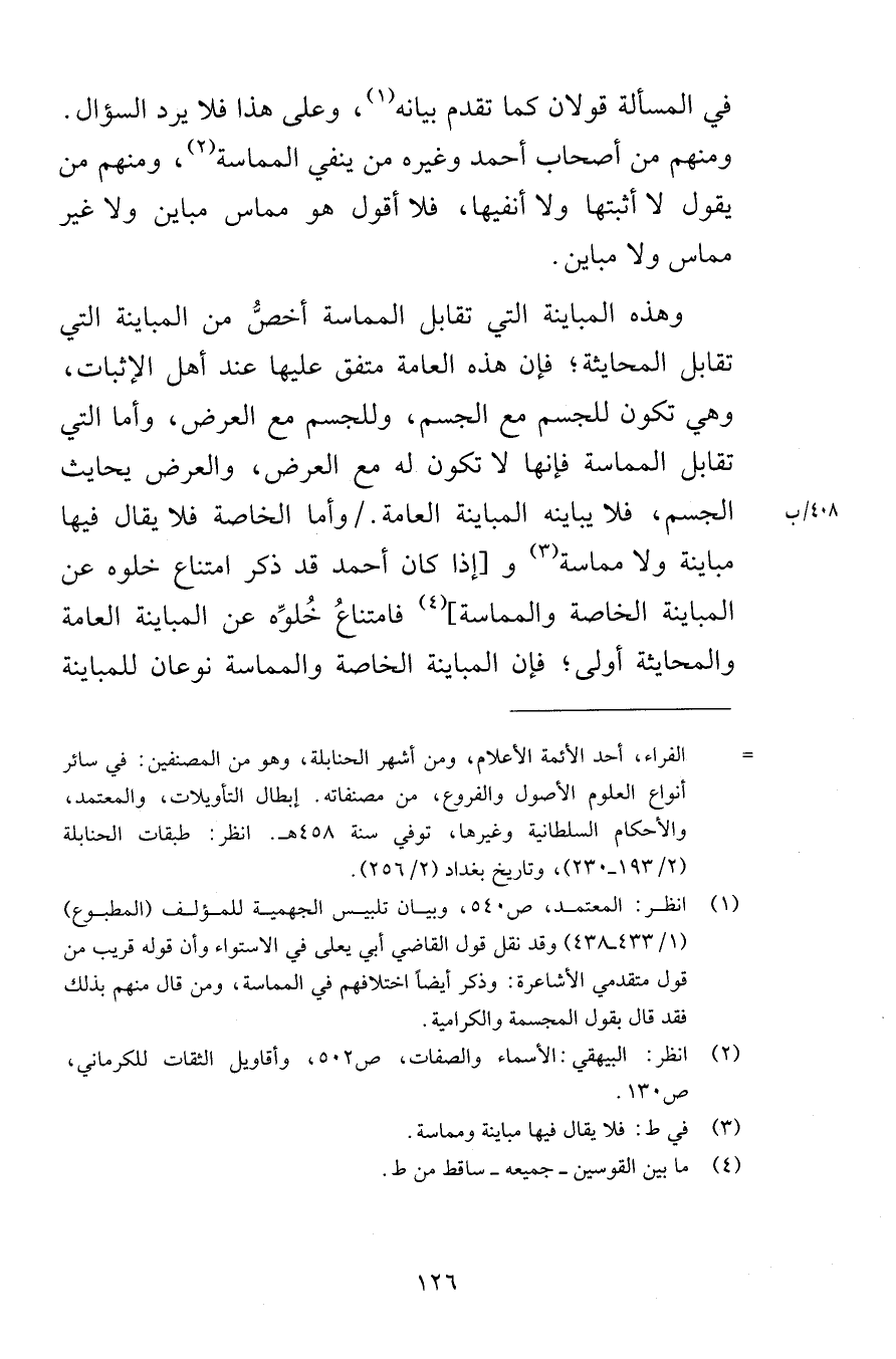 في المسألة قولان كما تقدم بيانه وعلى هذا فلا يرد السؤال ومنهم من أصحاب أحمد وغيره من ينفي المماسة ومنهم من يقول لا أثبتها ولا أنفيها فلا أقول هو مماس مباين ولا غير مماس ولا مباين وهذه المباينة التي تقابل المماسة أخصُّ من المباينة التي تقابل المحايثة فإن هذه العامة متفق عليها عند أهل الإثبات وهي تكون للجسم مع الجسم وللجسم مع العرض وأما التي تقابل المماسة فإنها لا تكون له مع العرض والعرض يحايث الجسم فلا يباينه المباينة العامة وأما الخاصة فلا يقال فيها مباينة ولا مماسة وإذا كان أحمد قد ذكر امتناع خلوه عن المباينة الخاصة والمماسة فامتناعُ خُلوِّه عن المباينة العامة والمحايثة أولى فإن المباينة الخاصة والمماسة نوعان للمباينة