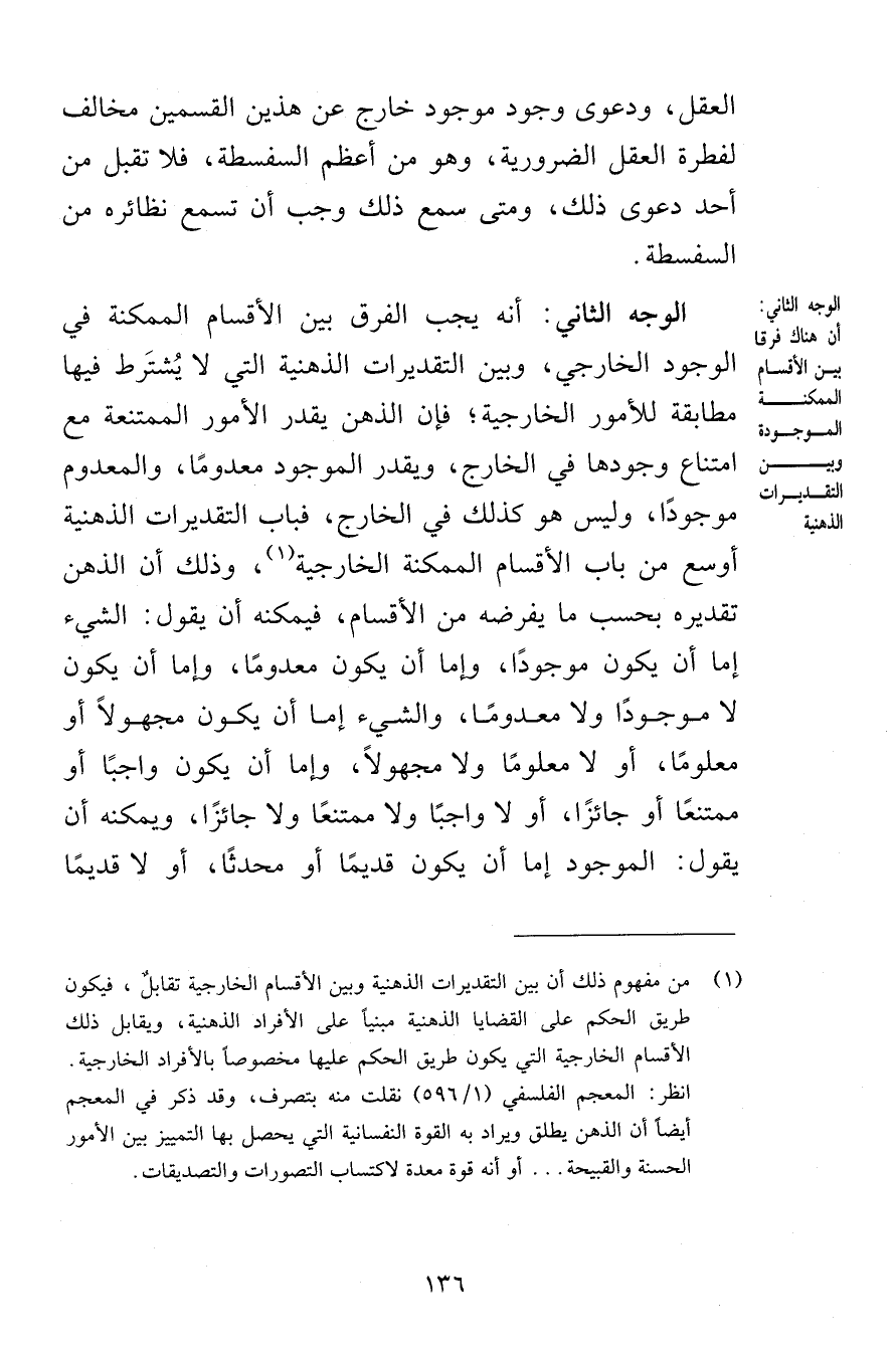 العقل ودعوى وجود موجود خارج عن هذين القسمين مخالف لفطرة العقل الضرورية وهو من أعظم السفسطة فلا تقبل من أحد دعوى ذلك ومتى سمع ذلك وجب أن تسمع نظائره من السفسطة الوجه الثاني أنه يجب الفرق بين الأقسام الممكنة في الوجود الخارجي وبين التقديرات الذهنية التي لا يُشتَرط فيها مطابقة للأمور الخارجية فإن الذهن يقدر الأمور الممتنعة مع امتناع وجودها في الخارج ويقدر الموجود معدومًا والمعدوم موجودًا وليس هو كذلك في الخارج فباب التقديرات الذهنية أوسع من باب الأقسام الممكنة الخارجية وذلك أن الذهن تقديره بحسب ما يفرضه من الأقسام فيمكنه أن يقول الشيء إما أن يكون موجودًا وإما أن يكون معدومًا وإما أن يكون لا موجودًا ولا معدومًا والشيء إما أن يكون مجهولاً أو معلومًا أو لا معلومًا ولا مجهولاً وإما أن يكون واجبًا أو ممتنعًا أو جائزًا أو لا واجبًا ولا ممتنعًا ولا جائزًا ويمكنه أن يقول الموجود إما أن يكون قديمًا أو محدثًا أو لا قديمًا