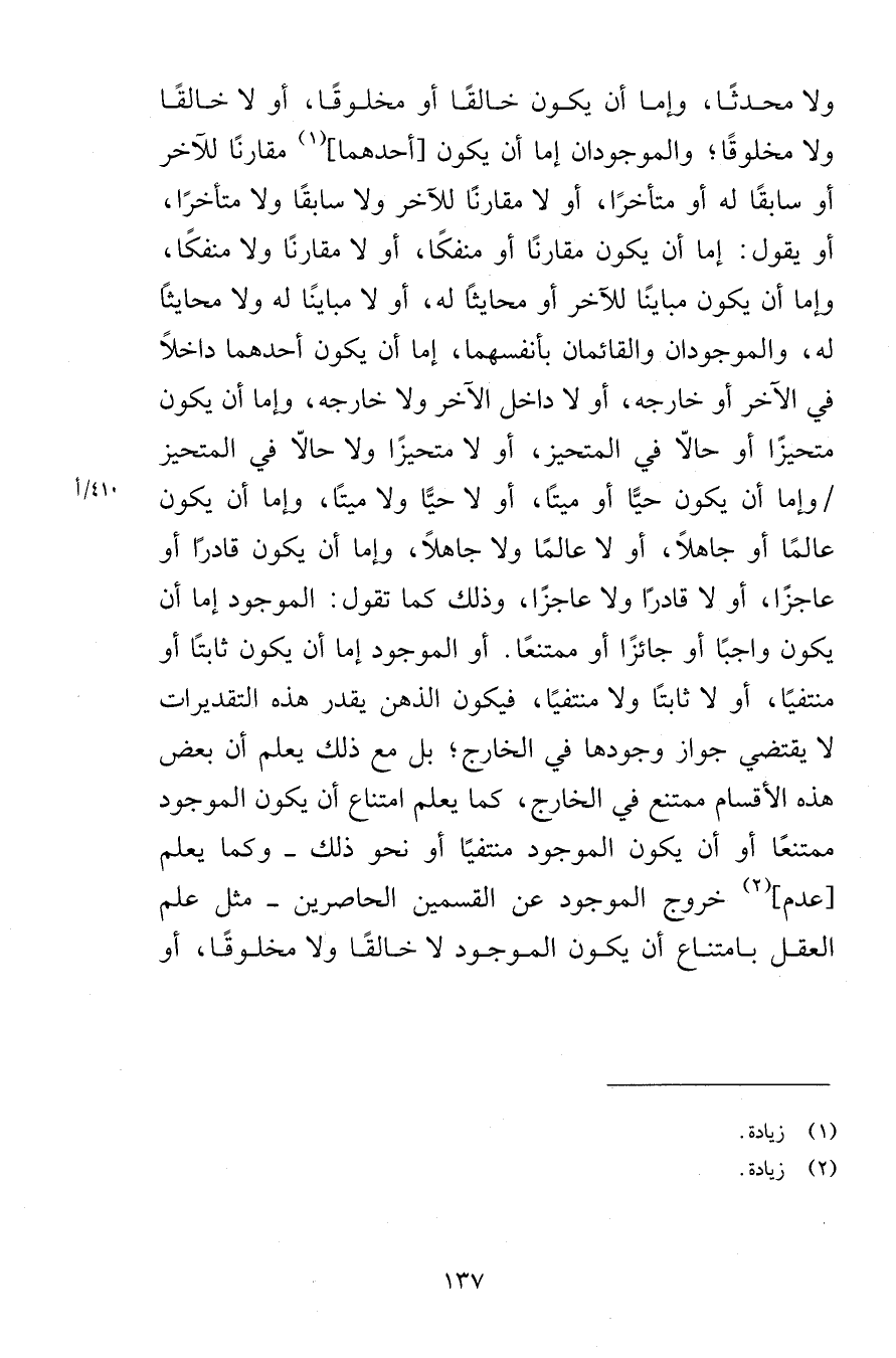 ولا محدثًا وإما أن يكون خالقًا أو مخلوقًا أو لا خالقًا ولا مخلوقًا والموجودان وإما أن يكون أحدهما مقارن للآخر ولا سابقًا ولا متأخرًا أو يقول إما أن يكون مقارنًا أو منفكًا أو لا مقارنًا ولا منفكًا وإما أن يكون مباينًا للآخر أو محايثًا له أو لا مباينًا له ولا محايثًا له والموجودان والقائمان بأنفسهما إما أن يكون أحدهما داخلاً في الآخر أو خارجه أو لا داخل الآخر ولا خارجه وإما أن يكون متحيزًا أو حالاّ في المتحيز أو لا متحيزًا ولا حالاّ في المتحيز وإما أن يكون حيًّا أو ميتًا أو لا حيًّا ولا ميتًا وإما أن يكون عالمًا أو جاهلاً أو لا عالمًا ولا جاهلاً وإما أن يكون قادرًا أو عاجزًا أو لا قادرًا ولا عاجزًا وذلك كما تقول الموجود إما أن يكون واجبًا أو جائزًا أو ممتنعًا أو الموجود إما أن يكون ثابتًا أو منتفيًا أو لا ثابتًا ولا منتفيًا فيكون الذهن يقدر هذه التقديرات لا يقتضي جواز وجودها في الخارج بل مع ذلك يعلم أن بعض هذه الأقسام ممتنع في الخارج كما يعلم امتناع أن يكون الموجود ممتنعًا أو أن يكون الموجود منتفيًا أو نحو ذلك وكما يعلم عدم خروج الموجود عن القسمين الحاصرين مثل علم العقل بامتناع أن يكون الموجود لا خالقًا ولا مخلوقًا أو