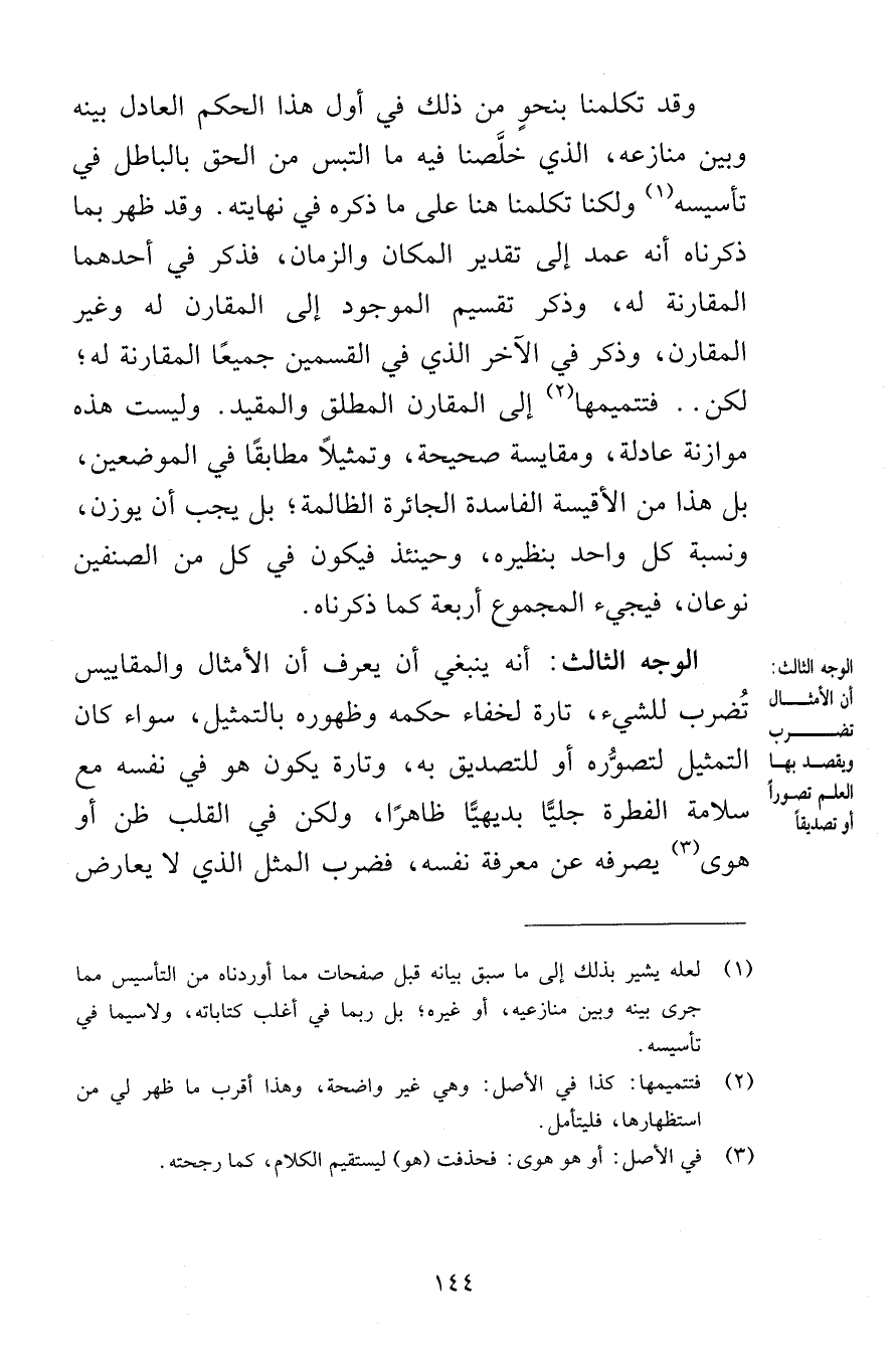 وقد تكلمنا بنحوٍ من ذلك في أول هذا الحكم العادل بينه وبين منازعه الذي خلَّصنا فيه ما التبس من الحق بالباطل في تأسيسه ولكنا تكلمنا هنا على ما ذكره في نهايته وقد ظهر بما ذكرناه أنه عمد إلى تقدير المكان والزمان فذكر في أحدهما المقارنة له وذكر تقسيم الموجود إلى المقارن له وغير المقارن وذكر في الآخر الذي في القسمين جميعًا المقارنة له لكن فتتميمها إلى المقارن المطلق والمقيد وليست هذه موازنة عادلة ومقايسة صحيحة وتمثيلاً مطابقًا في الموضعين بل هذا من الأقيسة الفاسدة الجائرة الظالمة بل يجب أن يوزن ونسبة كل واحد بنظيره وحينئذ فيكون في كل من الصنفين نوعان فيجيء المجموع أربعة كما ذكرناه الوجه الثالث أنه ينبغي أن يعرف أن الأمثال والمقاييس تُضرب للشيء تارة لخفاء حكمه وظهوره بالتمثيل سواء كان التمثيل لتصوُّره أو للتصديق به وتارة يكون هو في نفسه مع سلامة الفطرة جليًّا بديهيًّا ظاهرًا ولكن في القلب ظن أو هوى يصرفه عن معرفة نفسه فضرب المثل الذي لا يعارض