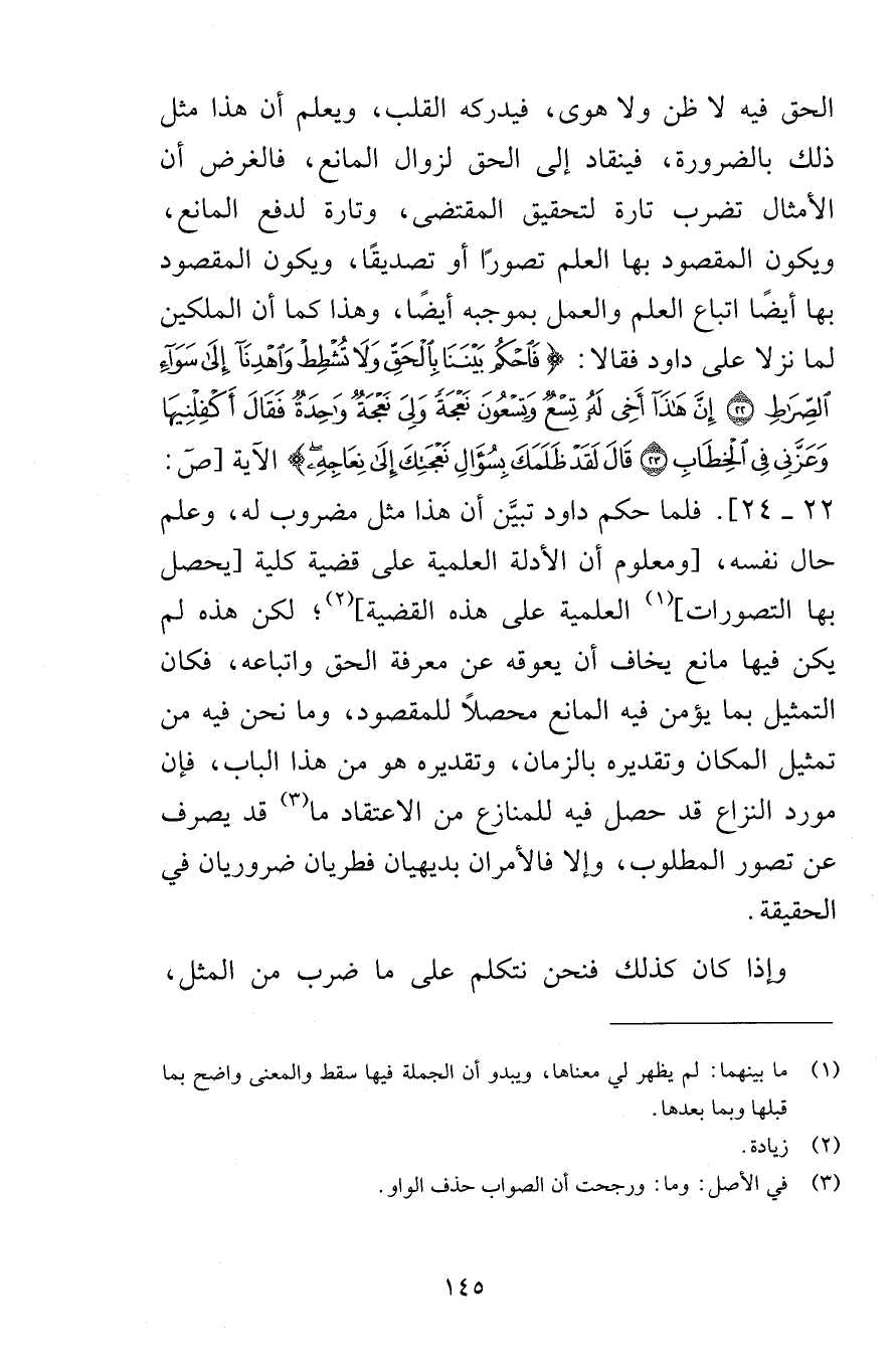 الحق فيه لا ظن ولا هوى فيدركه القلب ويعلم أن هذا مثل ذلك بالضرورة فينقاد إلى الحق لزوال المانع فالغرض أن الأمثال تضرب تارة لتحقيق المقتضى وتارة لدفع المانع ويكون المقصود بها العلم تصورًا أو تصديقًا ويكون المقصود بها أيضًا اتباع العلم والعمل بموجبه أيضًا وهذا كما أن الملكين لما نزلا على داود فقالا فَاحْكُم بَيْنَنَا بِالْحَقِّ وَلَا تُشْطِطْ وَاهْدِنَا إِلَى سَوَاء الصِّرَاطِ {22} إِنَّ هَذَا أَخِي لَهُ تِسْعٌ وَتِسْعُونَ نَعْجَةً وَلِيَ نَعْجَةٌ وَاحِدَةٌ فَقَالَ أَكْفِلْنِيهَا وَعَزَّنِي فِي الْخِطَابِ {23} قَالَ لَقَدْ ظَلَمَكَ بِسُؤَالِ نَعْجَتِكَ إِلَى نِعَاجِهِ الآية [ص 22 - 24] فلما حكم داود تبيَّن أن هذا مثل مضروب له وعلم حال نفسه ومعلوم أن الأدلة العلمية على قضية كلية يحصل بها التصورات العلمية على هذه القضية لكن هذه لم يكن فيها مانع يخاف أن يعوقه عن معرفة الحق واتباعه فكان التمثيل بما يؤمن فيه المانع محصلاً للمقصود وما نحن فيه من تمثيل المكان وتقديره بالزمان وتقديره هو من هذا الباب فإن مورد النزاع قد حصل فيه للمنازع من الاعتقاد ما قد يصرف عن تصور المطلوب وإلا فالأمران بديهيان فطريان ضروريان في الحقيقة وإذا كان كذلك فنحن نتكلم على ما ضرب من المثل
