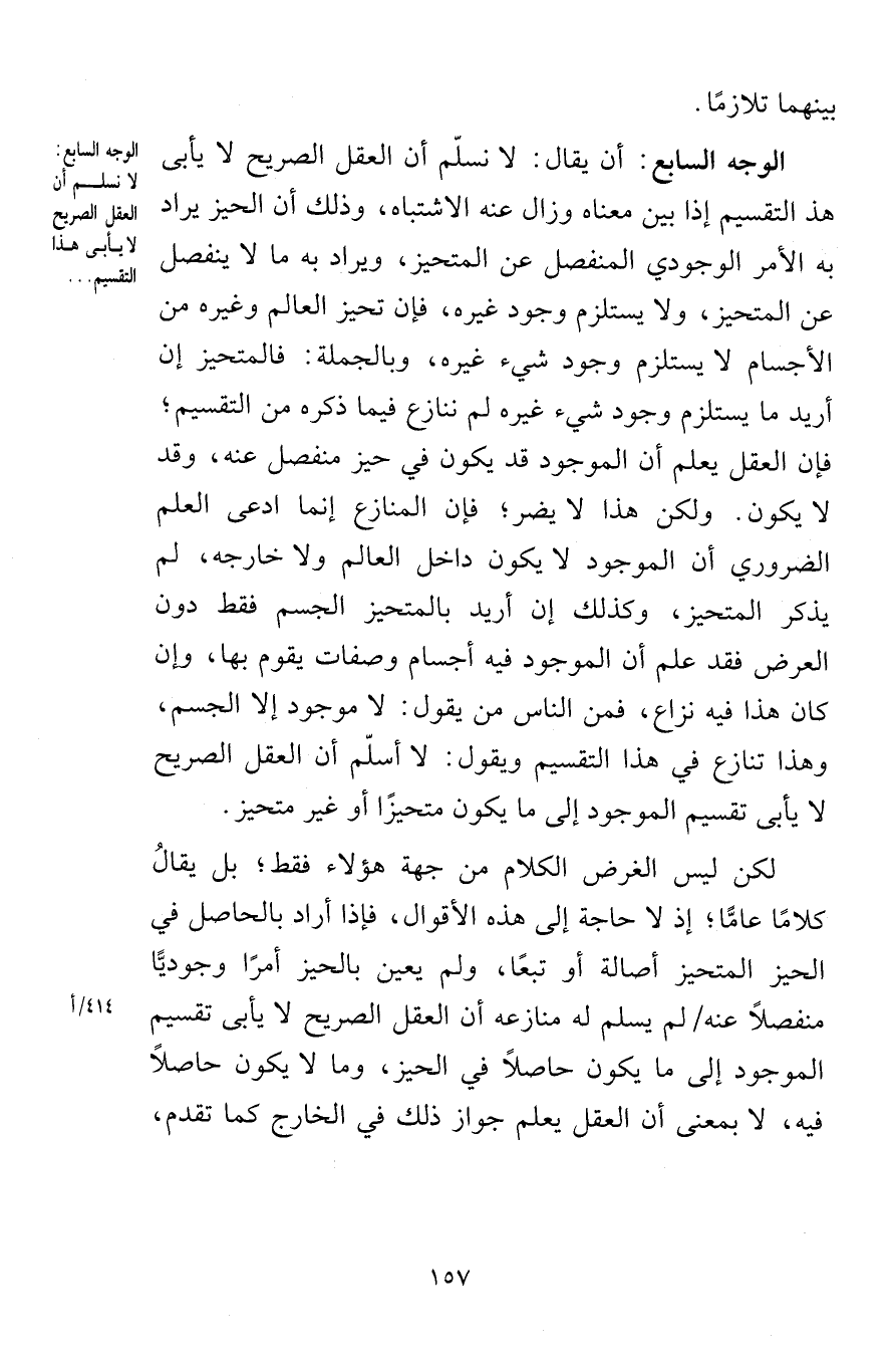 بينهما تلازمًا الوجه السابع أن يقال لا نسلّم أن العقل الصريح لا يأبى هذا التقسيم إذا بين معناه وزال عنه الاشتباه وذلك أن الحيز يراد به الأمر الوجودي المنفصل عن المتحيز ويراد به ما لا ينفصل عن المتحيز ولا يستلزم وجود غيره فإن تحيز العالم وغيره من الأجسام لا يستلزم وجود شيء غيره وبالجملة فالمتحيز إن أريد ما يستلزم وجود شيء غيره لم ننازع فيما ذكره من التقسيم فإن العقل يعلم أن الموجود قد يكون في حيز منفصل عنه وقد لا يكون ولكن هذا لا يضر فإن المنازع إنما ادعى العلم الضروري أن الموجود لا يكون داخل العالم ولا خارجه لم يذكر المتحيز وكذلك إن أريد بالمتحيز الجسم فقط دون العرض فقد علم أن الموجود فيه أجسام وصفات يقوم بها وإن كان هذا فيه نزاع ومن الناس من يقول لا موجود إلا الجسم وهذا تنازع في هذا التقسيم ويقول لا أسلّم أن العقل الصريح لا يأبى تقسيم الموجود إلى ما يكون متحيزًا أو غير متحيز لكن ليس الغرض الكلام من جهة هؤلاء فقط بل يقالُ كلامًا عامًّا إذ لا حاجة إلى هذه الأقوال فإذا أراد بالحاصل في الحيز المتحيز أصالة أو تبعًا ولم يعين بالحيز أمرًا وجوديًّا منفصلاً عنه لم يسلم له منازعه أن العقل الصريح لا يأبى تقسيم الموجود إلى ما يكون حاصلاً في الحيز وما لا يكون حاصلاً فيه لا بمعنى أن العقل يعلم جواز ذلك في الخارج كما تقدم