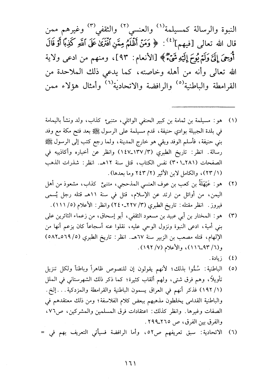 النبوة والرسالة كمسيلمة والعنسي والثقفي وغيرهم ممن قال الله تعالى فيهم وَمَنْ أَظْلَمُ مِمَّنِ افْتَرَى عَلَى اللهِ كَذِباً أَوْ قَالَ أُوْحِيَ إِلَيَّ وَلَمْ يُوحَ إِلَيْهِ شَيْءٌ [الأنعام 93] ومنهم من ادعى ولاية الله تعالى وأنه من أهله وخاصته كما يدعي ذلك الملاحدة من القرامطة والباطنية والرافضة والاتحادية وأمثال هؤلاء ممن