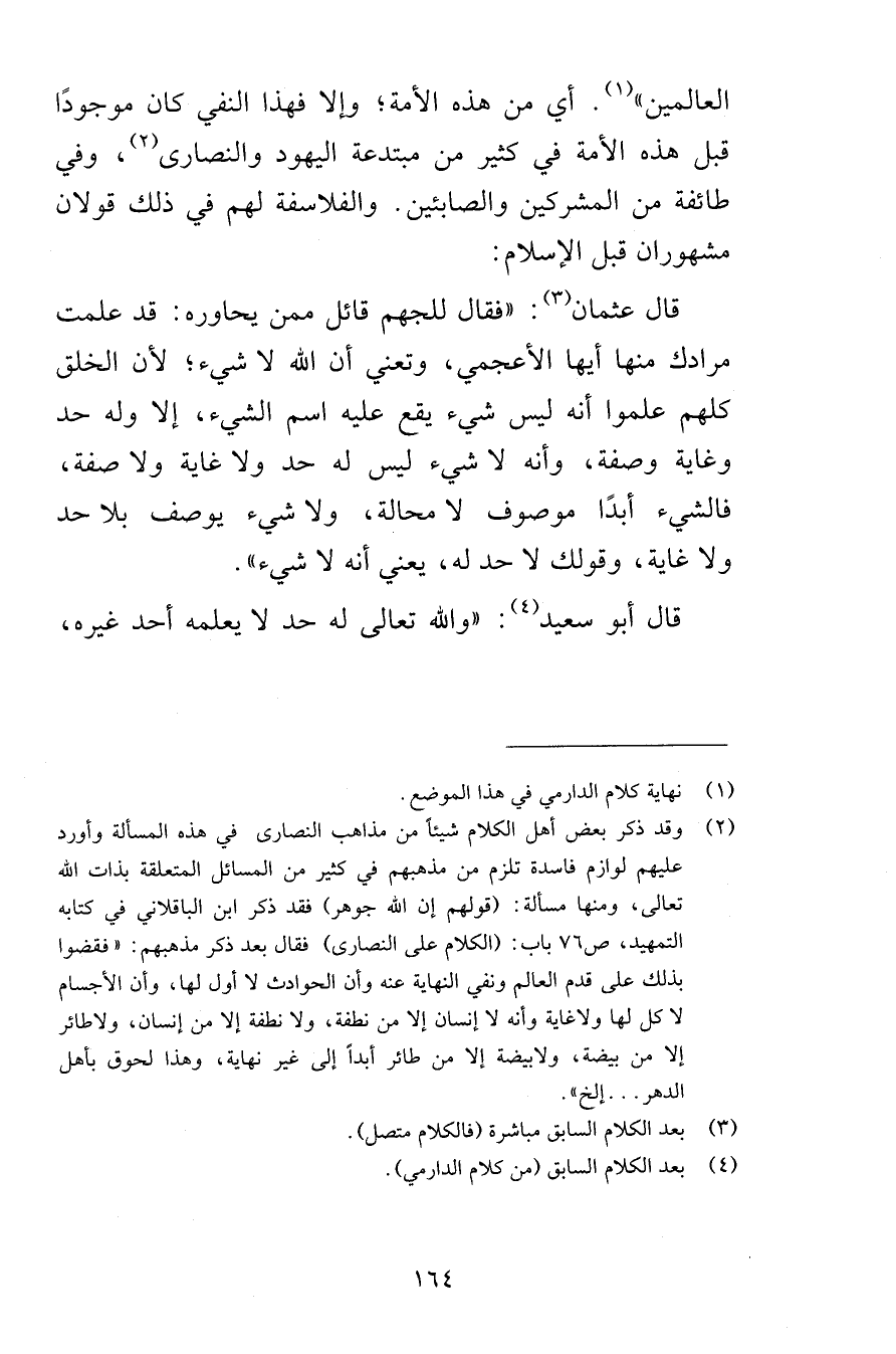العالمين أي من هذه الأمة وإلا فهذا النفي كان موجودًا قبل هذه الأمة في كثير من مبتدعه اليهود والنصارى وفي طائفة من المشركين والصابئين والفلاسفة لهم في ذلك قولان مشهوران قبل الإسلام قال عثمان فقال للجهم قائل ممن يحاوره قد علمت مرادك منها أيها الأعجمي وتعني أن الله لا شيء لأن الخلق كلهم علموا أنه ليس شيء يقع عليه اسم الشيء إلا وله حد وغاية وصفة وأنه لا شيء ليس له حد ولا غاية ولا صفة فالشيء أبدًا موصوف لا محالة ولا شيء يوصف بلا حد ولا غاية وقولك لا حد له يعني أنه لا شيء قال أبو سعيد والله تعالى له حد لا يعلمه أحد غيره
