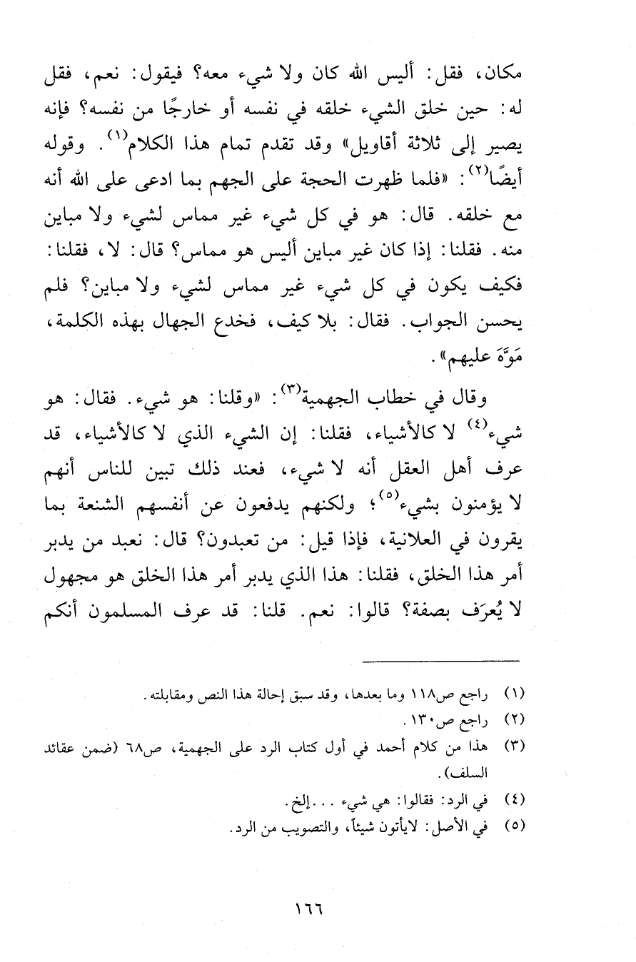 مكان فقل أليس الله كان ولا شيء معه فيقول نعم فقل له حين خلق الشيء خلقه في نفسه أو خارجًا من نفسه فإنه يصير إلى ثلاثة أقاويل وقد تقدم تمام هذا الكلام وقوله أيضًا فلما ظهرت الحجة على الجهم بما ادعى على الله أنه مع خلقه قال هو في كل شيء غير مماس لشيء ولا مباين منه فقلنا إذا كان غير مباين أليس هو مماس قال لا فقلنا فكيف يكون في كل شيء غير مماس لشيء ولا مباين فلم يحسن الجواب فقال بلا كيف فخدع الجهال بهذه الكلمة مَوَّهَ عليهم وقال في خطاب الجهمية وقلنا هو شيء فقال هو شيء لا كالأشياء فقلنا إن الشيء الذي لا كالأشياء قد عرف أهل العقل أنه لا شيء فعند ذلك تبين للناس أنهم لا يؤمنون بشيء ولكنهم يدفعون عن أنفسهم الشنعة بما يقرون في العلانية فإذا قيل من تعبدون قال نعبد من يدبر أمر هذا الخلق فقلنا هذا الذي يدبر أمر هذا الخلق هو مجهول لا يُعرَف بصفة قالوا نعم قلنا قد عرف المسلمون أنكم