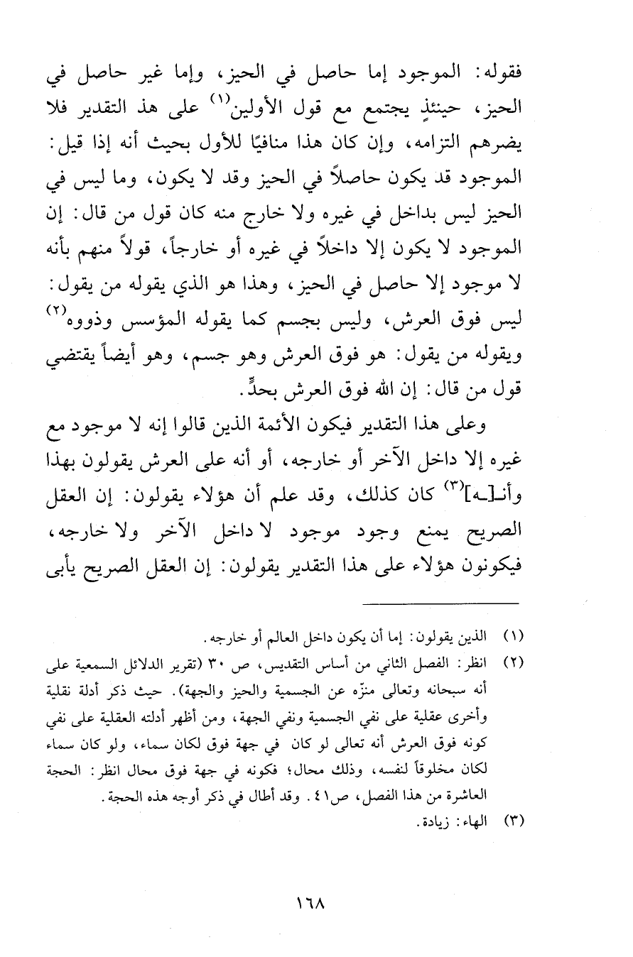 فقوله الموجود إما حاصل في الحيز وإما غير حاصل في الحيز حينئذٍ يجتمع مع قول الأولين على هذا التقدير فلا يضرهم التزامه وإن كان هذا منافيًا للأول بحيث أنه إذا قيل الموجود قد يكون حاصلاً في الحيز وقد لا يكون وما ليس في الحيز ليس بداخل في غيره ولا خارج منه كان قول من قال إن الموجود لا يكون إلا داخلاً في غيره أو خارجًا قولاً منهم بأنه لا موجود إلا حاصل في الحيز وهذا هو الذي يقوله من يقول ليس فوق العرش وليس بجسم كما يقوله المؤسس وذووه ويقوله من يقول هو فوق العرش وهو جسم وهو أيضًا يقتضي قول من قال إن الله فوق العرش بحدٍّ وعلى هذا التقدير فيكون الأئمة الذين قالوا إنه لا موجود مع غيره إلا داخل الآخر أو خارجه أو أنه على العرش يقولون بهذا وأنـ ـه كان كذلك وقد علم أن هؤلاء يقولون إن العقل الصريح يمنع وجود موجود لا داخل الآخر ولا خارجه فيكونون هؤلاء على هذا التقدير يقولون إن العقل الصريح يأبى