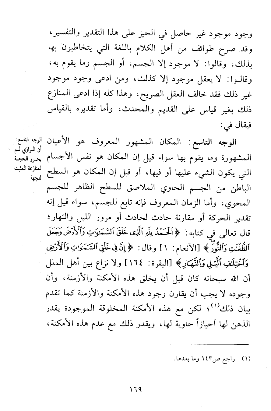وجود موجود غير حاصل في الحيز على هذا التقدير والتفسير وقد صرح طوائف من أهل الكلام باللغة التي يتخاطبون بها بذلك وقالوا لا موجود إلا الجسم أو الجسم وما يقوم به وقالوا لا يعقل موجود إلا كذلك ومن ادعى وجود موجود غير ذلك فقد خالف العقل الصريح وهذا كله إذا ادعى المنازع ذلك بغير قياس على القديم والمحدث وأما تقديره بالقياس فيقال في الوجه التاسع المكان المشهور المعروف هو الأعيان المشهورة وما يقوم بها سواء قيل إن المكان هو نفس الأجسام التي يكون الشيء عليها أو فيها أو قيل إن المكان هو السطح الباطن من الجسم الحاوي الملاصق للسطح الظاهر للجسم المحوي وأما الزمان المعروف فإنه تابع للجسم سواء قيل إنه تقدير الحركة أو مقارنة حادث لحادث أو مرور الليل والنهار قال تعالى في كتابه الْحَمْدُ لِلّهِ الَّذِي خَلَقَ السَّمَاوَاتِ وَالأَرْضَ وَجَعَلَ الظُّلُمَاتِ وَالنُّورَ [الأنعام 1] وقال إِنَّ فِي خَلْقِ السَّمَاوَاتِ وَالأَرْضِ وَاخْتِلاَفِ اللَّيْلِ وَالنَّهَارِ [البقرة 164] ولا نزاع بين أهل الملل أن الله سبحانه كان قبل أن يخلق هذه الأمكنة والأزمنة وأن وجوده لا يجب أن يقارن وجود هذه الأمكنة والأزمنة كما تقدم بيان ذلك لكن مع هذه الأمكنة المخلوقة الموجودة يقدر الذهن لها أحيازًا حاوية لها ويقدر ذلك مع عدم هذه الأمكنة
