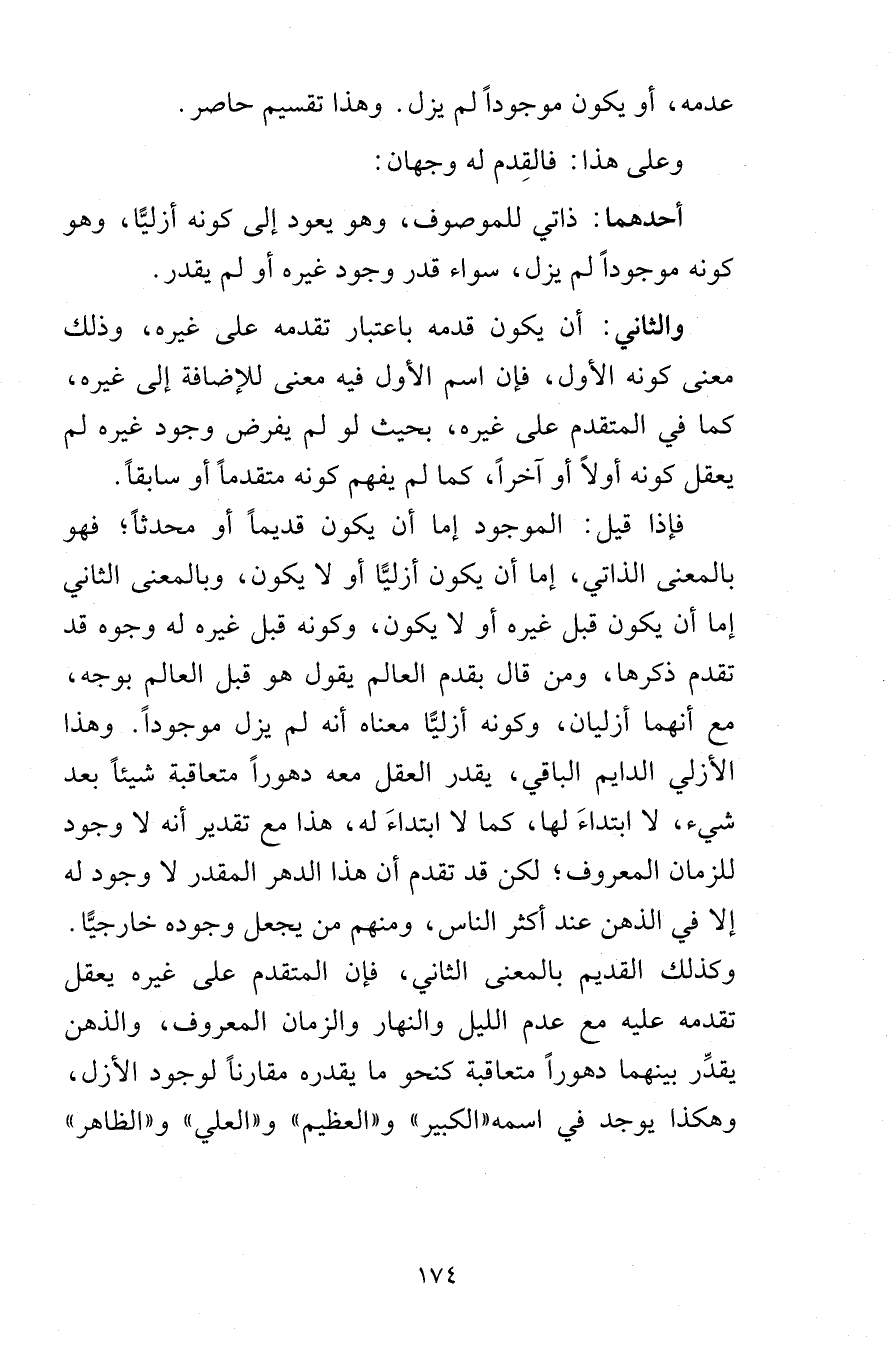 عدمه أو يكون موجوداً لم يزل وهذا تقسيم حاصر وعلى هذا فالقِدم له وجهان أحدهما ذاتي للموصوف وهو يعود إلى كونه أزليًّا وهو كونه موجوداً لم يزل سواء قدر وجود غيره أو لم يقدر والثاني أن يكون قدمه باعتبار تقدمه على غيره وذلك معنى كونه الأول فإن اسم الأول فيه معنى للإضافة إلى غيره كما في المتقدم على غيره بحيث لو لم يفرض وجود غيره لم يعقل كونه أولاً أو آخراً كما لم يفهم كونه متقدماً أو سابقاً فإذا قيل الموجود إما أن يكون قديماً أو محدثاً فهو بالمعنى الذاتي إما أن يكون أزليًّا أو لا يكون وبالمعنى الثاني إما أن يكون قبل غيره أو لا يكون وكونه قبل غيره له وجوه قد تقدم ذكرها ومن قال بقدم العالم يقول هو قبل العالم بوجه مع أنهما أزليان وكنوه أزليًّا معناه أنه لم يزل موجوداً وهذا الأزلي الدايم الباقي يقدر العقل معه دهوراّ متعاقبة شيئاً بعد شيء لا ابتداءَ لها كما لا ابتداءَ له هذا مع تقدير أنه لا وجود للزمان المعروف لكن قد تقدم أن هذا الدهر المقدر لا وجود له إلا في الذهن عند أكثر الناس ومنهم من يجعل وجوده خارجيًّا وكذلك القديم بالمعنى الثاني فإن المتقدم على غيره يعقل تقدمه عليه مع عدم الليل والنهار والزمان المعروف والذهن يقدِّر بينهما دهوراً متعاقبة كنحو ما يقدره مقارناً لوجود الأزل وهكذا يوجد في اسمه الكبير والعظيم والعلي والظاهر