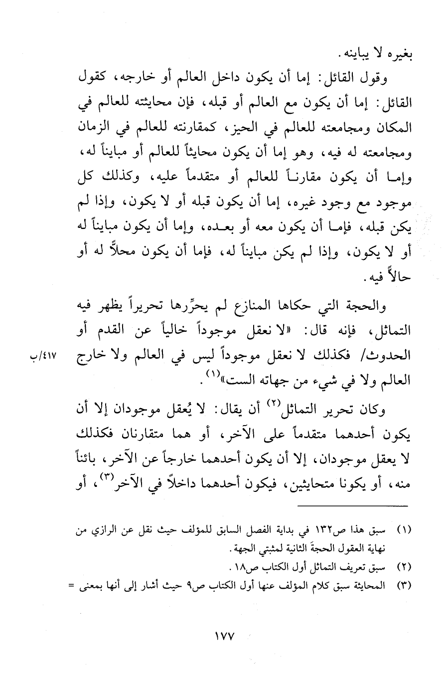 بغيره لا يباينه وقول القائل إما أن يكون داخل العالم أو خارجه كقول القائل إما أن يكون مع العالم أو قبله فإن محايثته للعالم في المكان ومجامعته للعالم في الحيز كمقارنته للعالم في الزمان ومجامعته له فيه وهو إما أن يكون محايثاً للعالم أو مبايناً له وإما أن يكون مقارناً للعالم أو متقدماً عليه وكذلك كل موجود مع وجود غيره إما أن يكون قبله أو لا يكون وإذا لم يكن قبله فإما أن يكون معه أو بعده وإما أن يكون مبايناً له فإما أن يكون محلاًّ له أو حالاًّ فيه والحجة التي حكاها المنازع لم يحرِّرها تحريراً يظهر فيه التماثل فإنه قال لا نعقل موجوداً خالياً عن القدم أو الحدوث فكذلك لا نعقل موجوداً ليس في العالم ولا خارج العالم ولا في شيء من جهاته الست وكان تحرير التماثل أن يقال لا يُعقل موجودان إلا أن يكون أحدهما متقدماً على الآخر أو هما متقارنان فكذلك لا يعقل موجودان إلا أن يكون أحدهما خارجاً عن الآخر بائناً منه أو يكونا متحايثين فيكون أحدهما داخلاً في الآخر أو