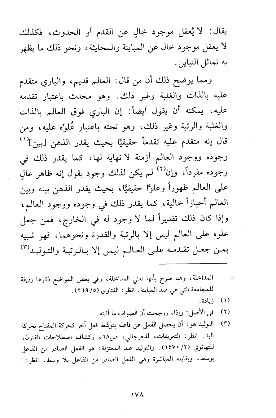 يقال لا يُعقل موجود خالٍ عن القدم أو الحدوث فكذلك لا يعقل موجود خال عن المباينة والمحايثة ونحو ذلك ما يظهر به تماثل التباين ومما يوضح ذلك أن من قال العالم قديم والباري متقدم عليه بالذات والغلبة وغير ذلك وهو محدث باعتبار تقدمه عليه يمكنه أن يقول أيضاً إن الباري فوق العالم بالذات والغلبة والرتبة وغير ذلك وهو تحته باعتبار عُلوَِه عليه ومن قال إنه متقدم عليه تقدماً حقيقيًّا بحيث يقدر الذهن بين وجوده ووجود العالم أزمنة لا نهاية لها كما يقدر ذلك في وجوده مفرداً وإن لم يكن لذلك وجود يقول إنه ظاهر عالٍ على العالم ظهوراً وعلوًّا حقيقيًّا بحيث يقدر الذهن بينه وبين العالم أحيازًا خالية كما يقدر ذلك في وجوده ووجود العالم وإذا كان ذلك تقديراً لما لا وجود له في الخارج فمن جعل علوه على العالم ليس إلا بالرتبة والقدرة ونحوهما فهو شبيه بمن جعل تقدمه على العالم ليس إلا بالرتبة والتوليد