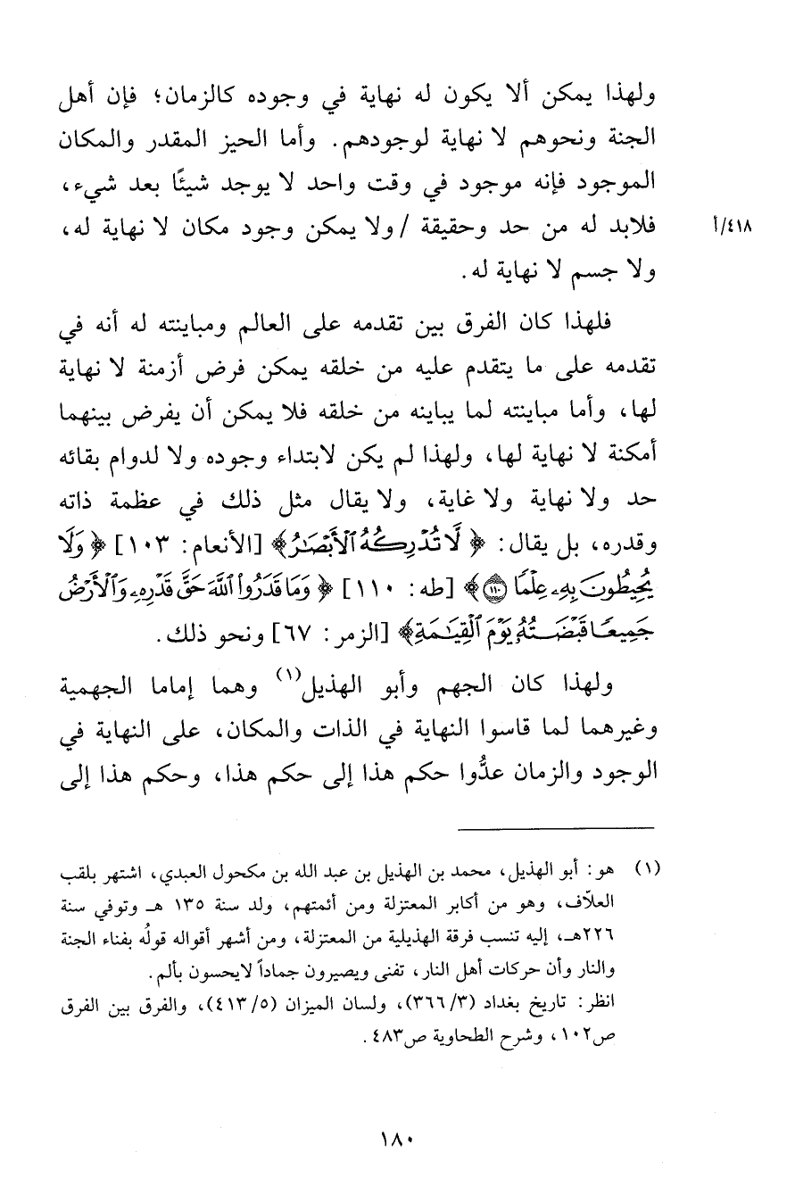 ولهذا يمكن ألا يكون له نهاية في وجوده كالزمان فإن أهل الجنة ونحوهم لا نهاية لوجودهم وأما الحيز المقدر والمكان الموجود فإنه موجود في وقت واحد لا يوجد شيئًا بعد شيء فلابد له من حد وحقيقة ولا يمكن وجود مكان لا نهاية له ولا جسم لا نهاية له فلهذا كان الفرق بين تقدمه على العالم ومباينته له أنه في تقدمه على ما يتقدم عليه من خلقه يمكن فرض أزمنة لا نهاية لها وأما مباينته لما يباينه من خلقه فلا يمكن أن يفرض بينهما أمكنة لا نهاية لها ولهذا لم يكن لابتداء وجوده ولا لدوام بقائه حد ولا نهاية ولا غاية ولا يقال مثل ذلك في عظمة ذاته وقدره بل يقال لاَّ تُدْرِكُهُ الأَبْصَارُ [الأنعام 103] وَلَا يُحِيطُونَ بِهِ عِلْماً {110} [طه 110] وَمَا قَدَرُوا اللَّهَ حَقَّ قَدْرِهِ [الزمر 67] ونحو ذلك ولهذا كان الجهم وأبو الهذيل وهما إماما الجهمية وغيرهما لما قاسوا النهاية في الذات والمكان على النهاية في الوجود والزمان عدُّوا حكم هذا إلى حكم هذا وحكم هذا إلى
